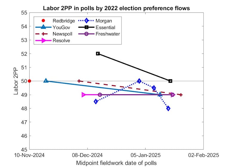 In three of the last four Newspolls, the Coalition has had a 51–49 lead. This is the consensus of the polls at the moment, as can be seen from the graph below. The federal election is not due until May, and this position is recoverable for Labor, but they would probably lose now. I had more comments on this last Thursday.