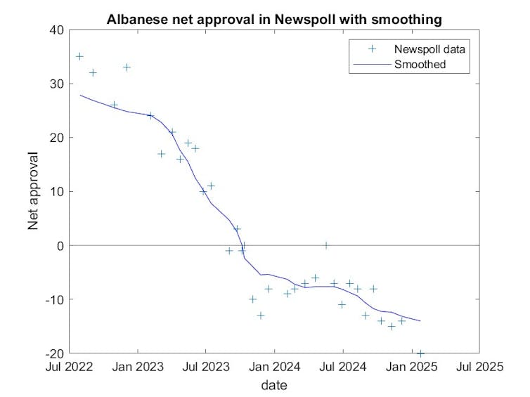 The graph below shows Albanese’s Newspoll ratings this term. The individual polls are marked with plus signs and a smoothed line has been fitted.