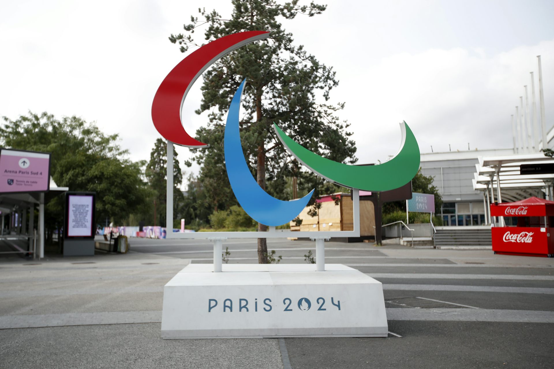 The Paralympic logo is seen at the Arena Paris Sud venue ahead of the Paralympic Games on Aug. 19 in Paris.