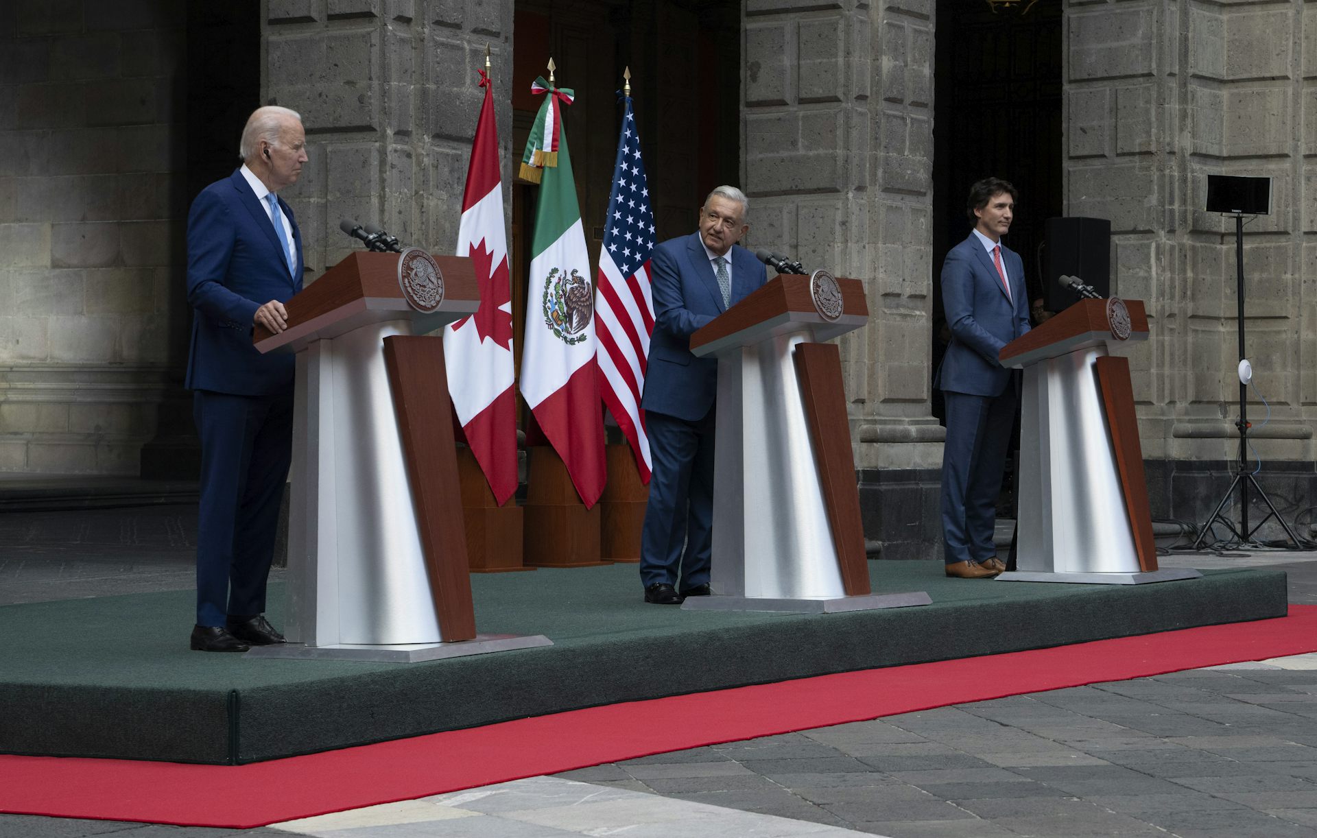 United States President Joe Biden and Prime Minister Justin Trudeau listen to Mexican President Andres Manuel Lopez Obrador speak during a joint news conference at the North American Leaders Summit in January 2023 in Mexico City, Mexico.
