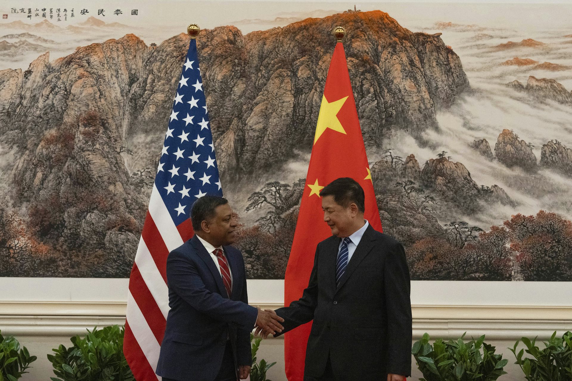 Dr. Rahul Gupta, head of the White House’s Office of National Drug Control Policy (left) shakes hands with the Chinese Minister of Public Security Wang Xiaohong in Beijing in June 2024.