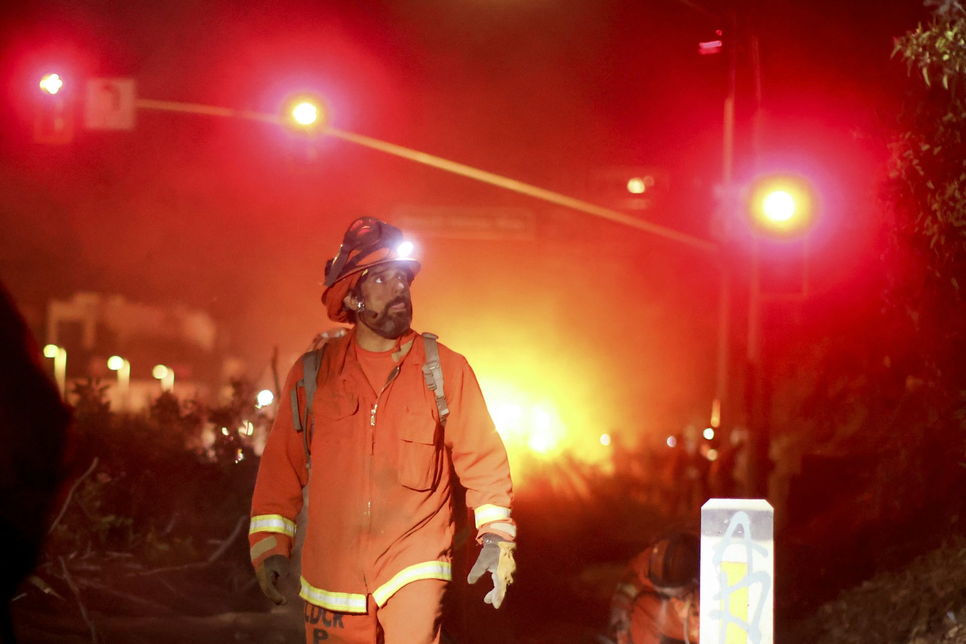 A California Department of Corrections hand crew works containment lines ahead of the Palisades Fire on Jan. 14, 2025 in Santa Monica, Calif.