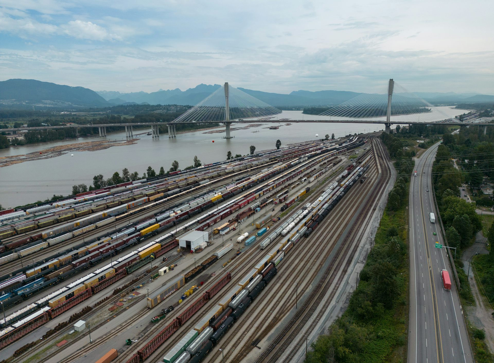 Freight cars are seen on the tracks in an aerial view at Canadian National Rail’s Thornton Yard in Surrey, B.C., in Aug. 2024.