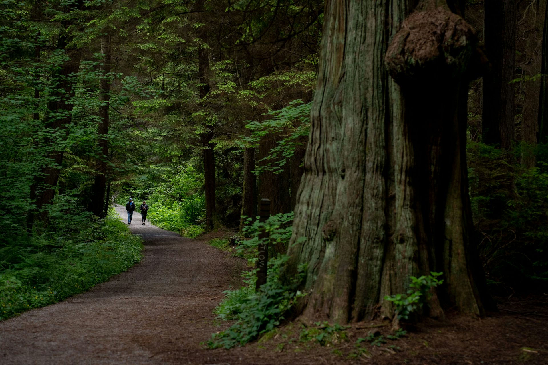 People walk down a path surrounded by large trees at Stanley Park in Vancouver, on June 21, 2023.