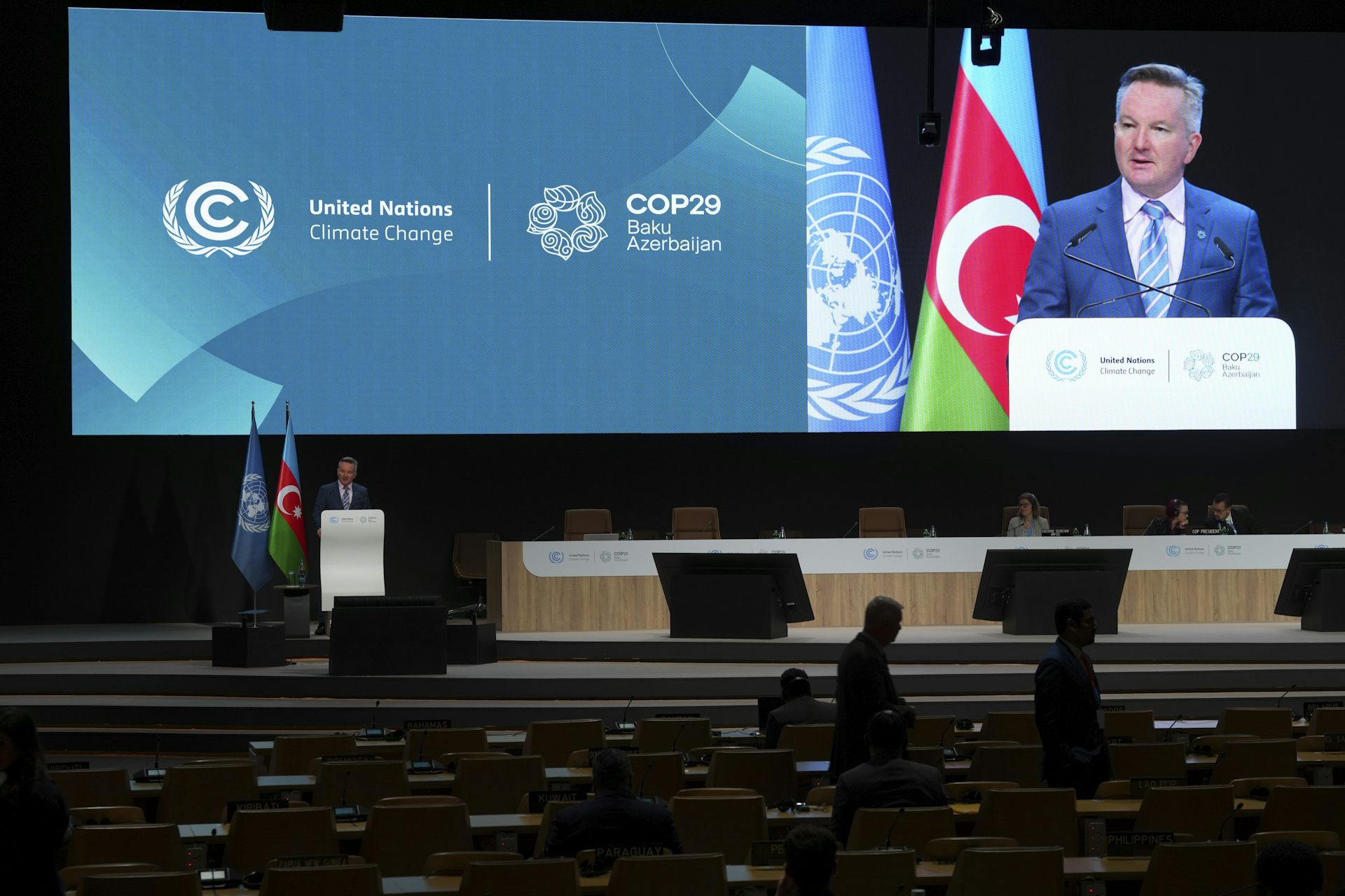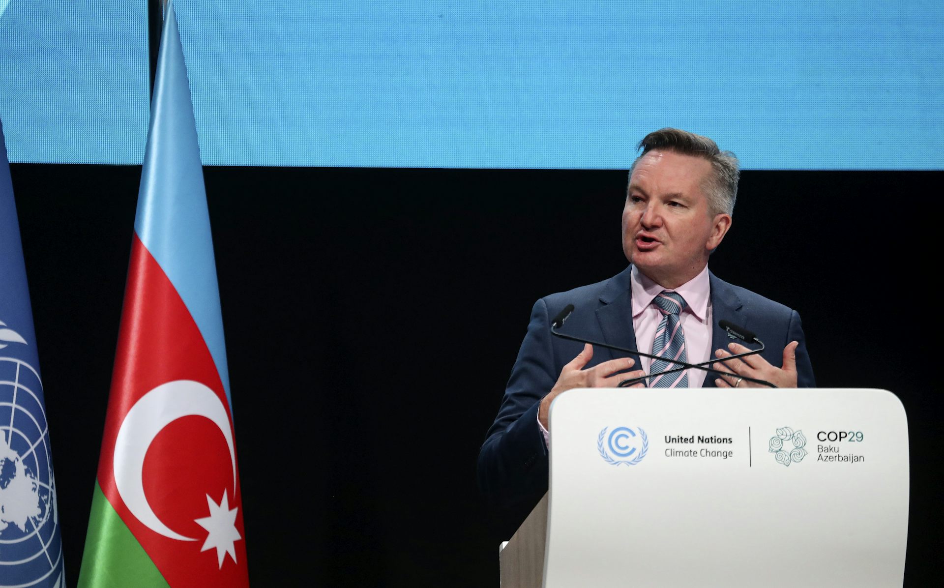 Minister for Climate Change and Energy, Chris Bowen, delivers his statement during a session of the UN Climate Change Conference in Baku.