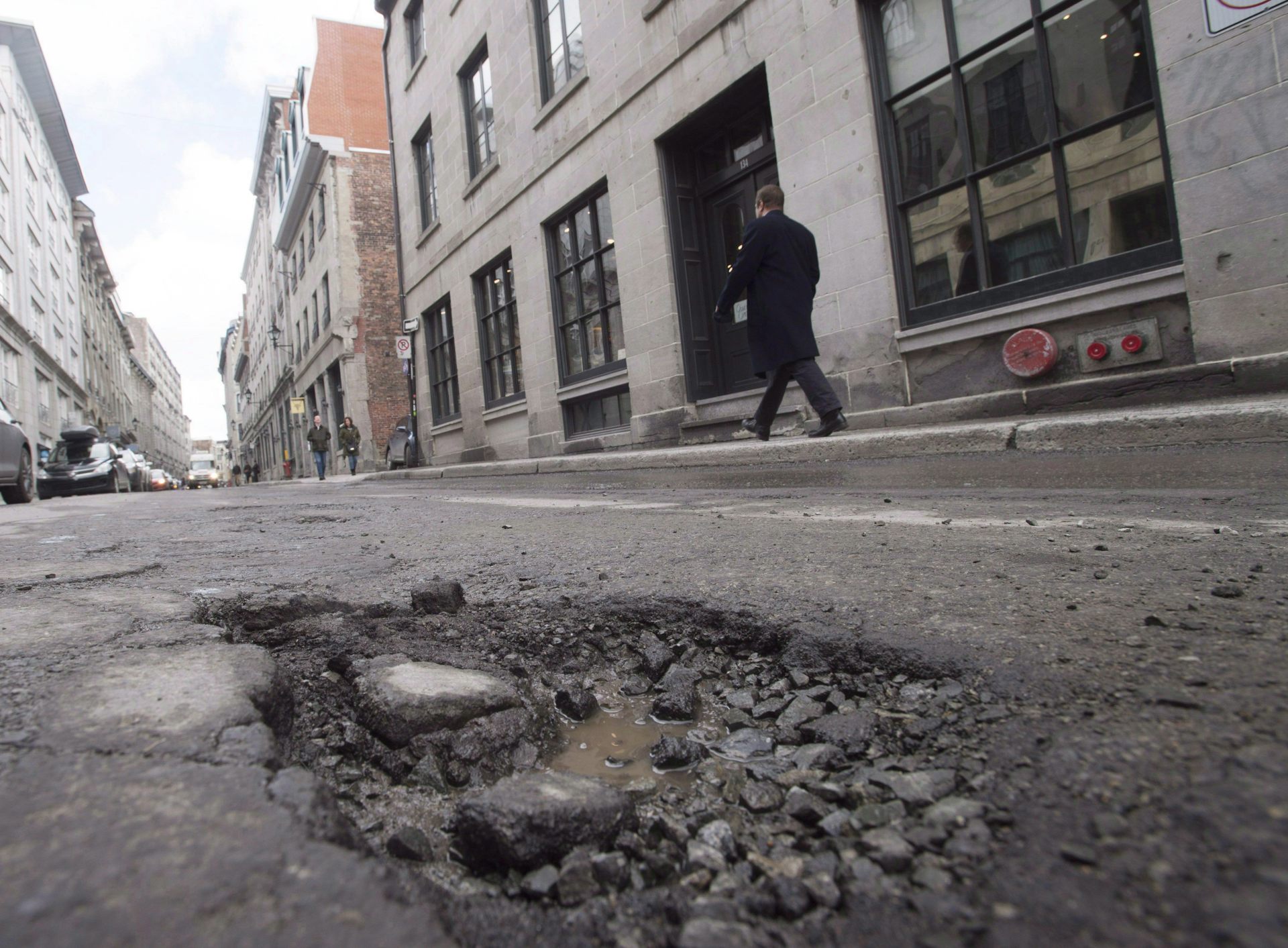 Un nid-de-poule sur la rue Saint-Paul, à Montréal. Malgré les discussions récurrentes, les solutions durables peinent à s’imposer au Québec. Pourtant, il existe de nombreuses solutions pour construire des routes plus résistantes aux conditions météorologiques.