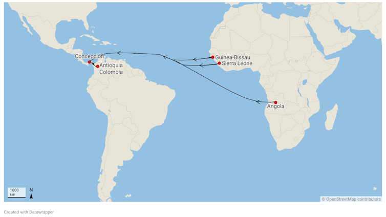 Uma ação judicial movida contra um traficante de pessoas escravizadas em 1589 em Antioquia (uma província na atual Colômbia) me permitiu traçar os caminhos de 11 mulheres e homens africanos escravizados. Esse traficante precisava provar que os cativos entraram legalmente tanto nos navios na África e quanto na operação de mineração na América do Sul.