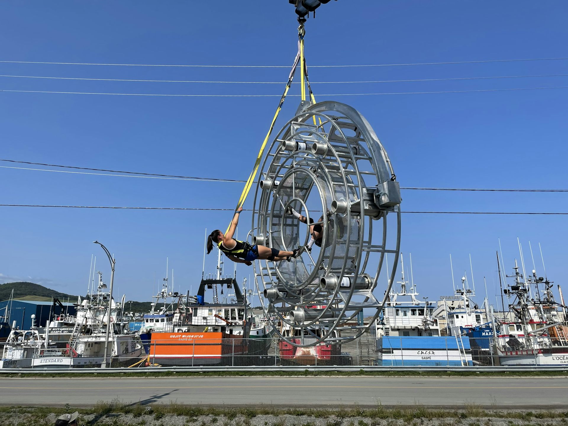 Le O d'écH2osystème est une roue de quatre mètres de diamètre qui s’accroche au moyen d’une grue sur le pont d’un navire, un quai ou sur les berges du Saint-Laurent des petites et grandes municipalités.