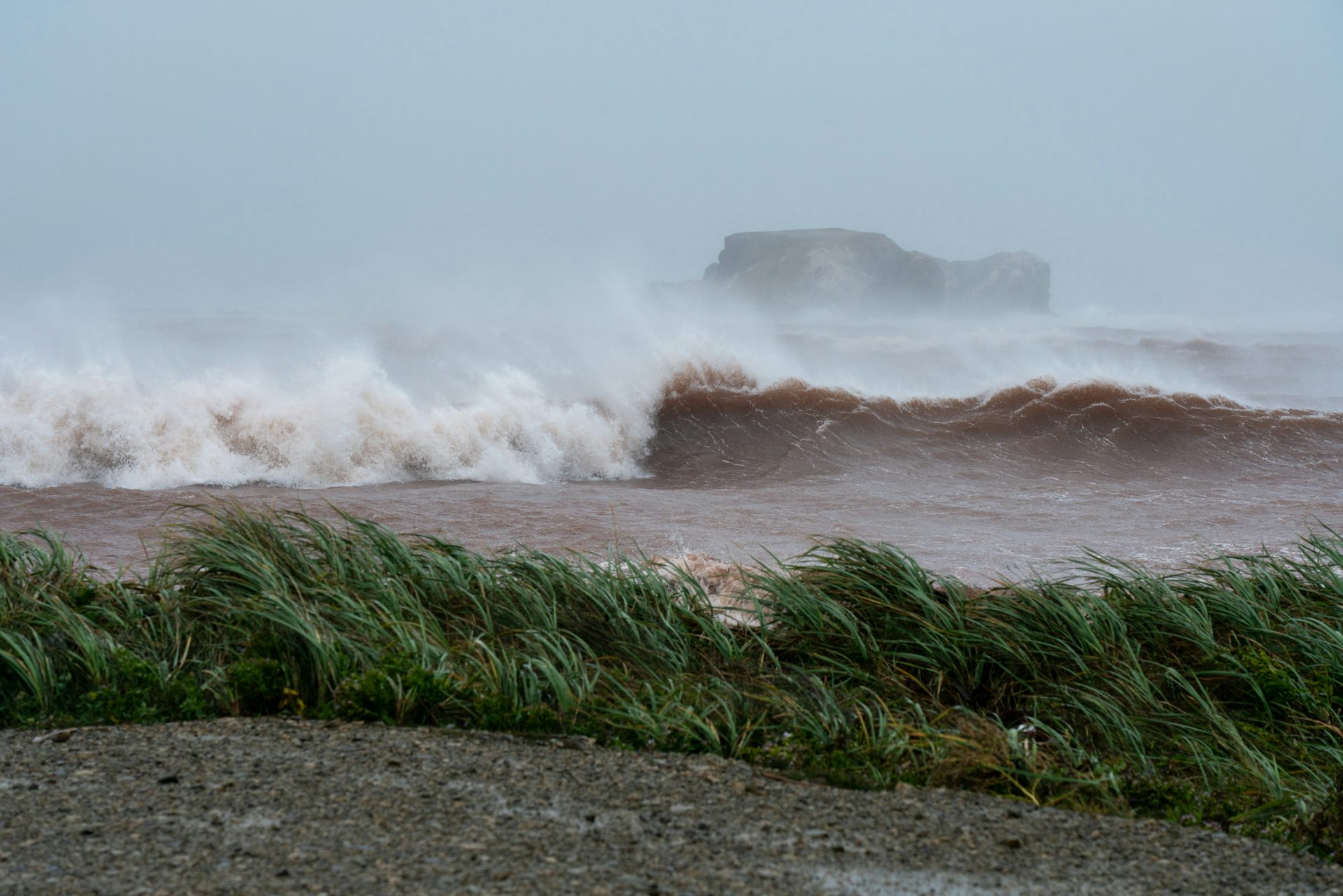 Des vagues déferlant sur le rivage de l'Étang-du-Nord, aux Îles-de-la-Madeleine, lors de la tempête post-tropicale Fiona, le samedi 24 septembre 2022.
