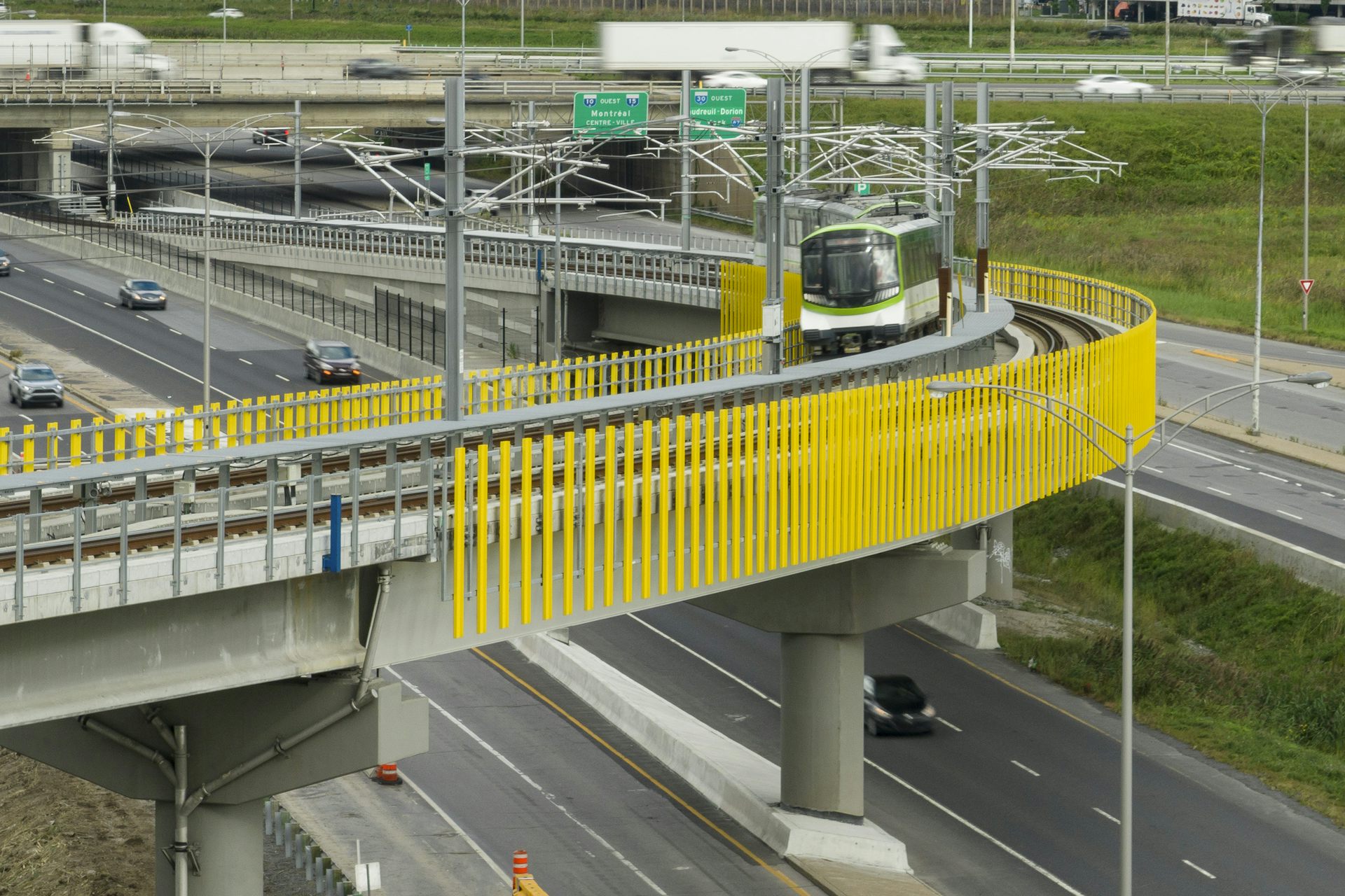 Circulation d'un train du REM, à Brossard. Le projet de la CDPQ Infra peut être qualifié de succès à plusieurs égards, selon l'auteure, notamment grâce à leurs superpouvoirs légiférés et à leur approche modulaire, par tronçons.