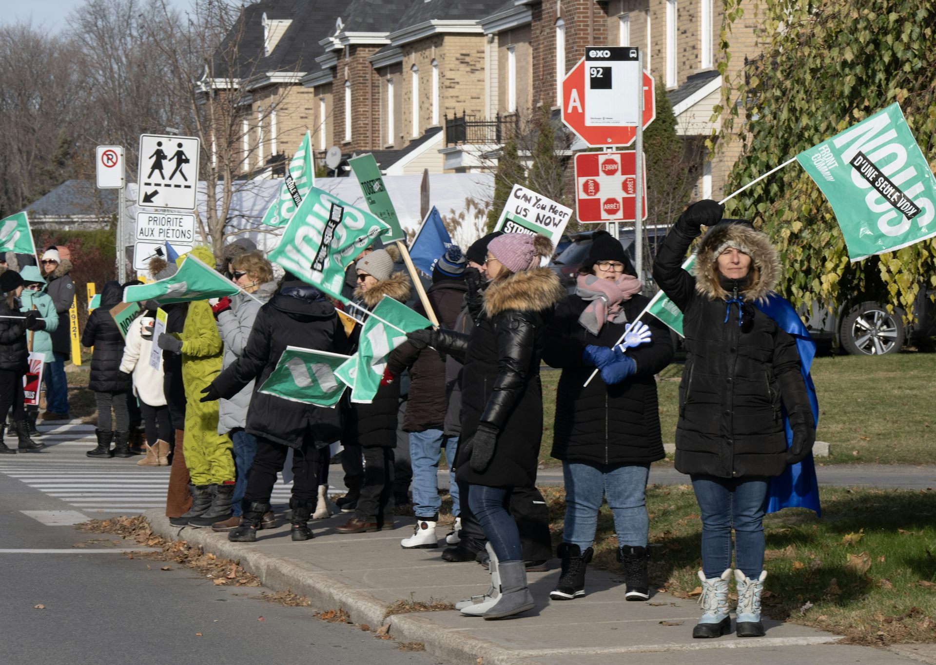 Des enseignants forment une ligne de piquetage devant leur école à Deux-Montagnes, au Québec, le 21 novembre 2023, alors que 420 000 enseignants québécois sont en grève.