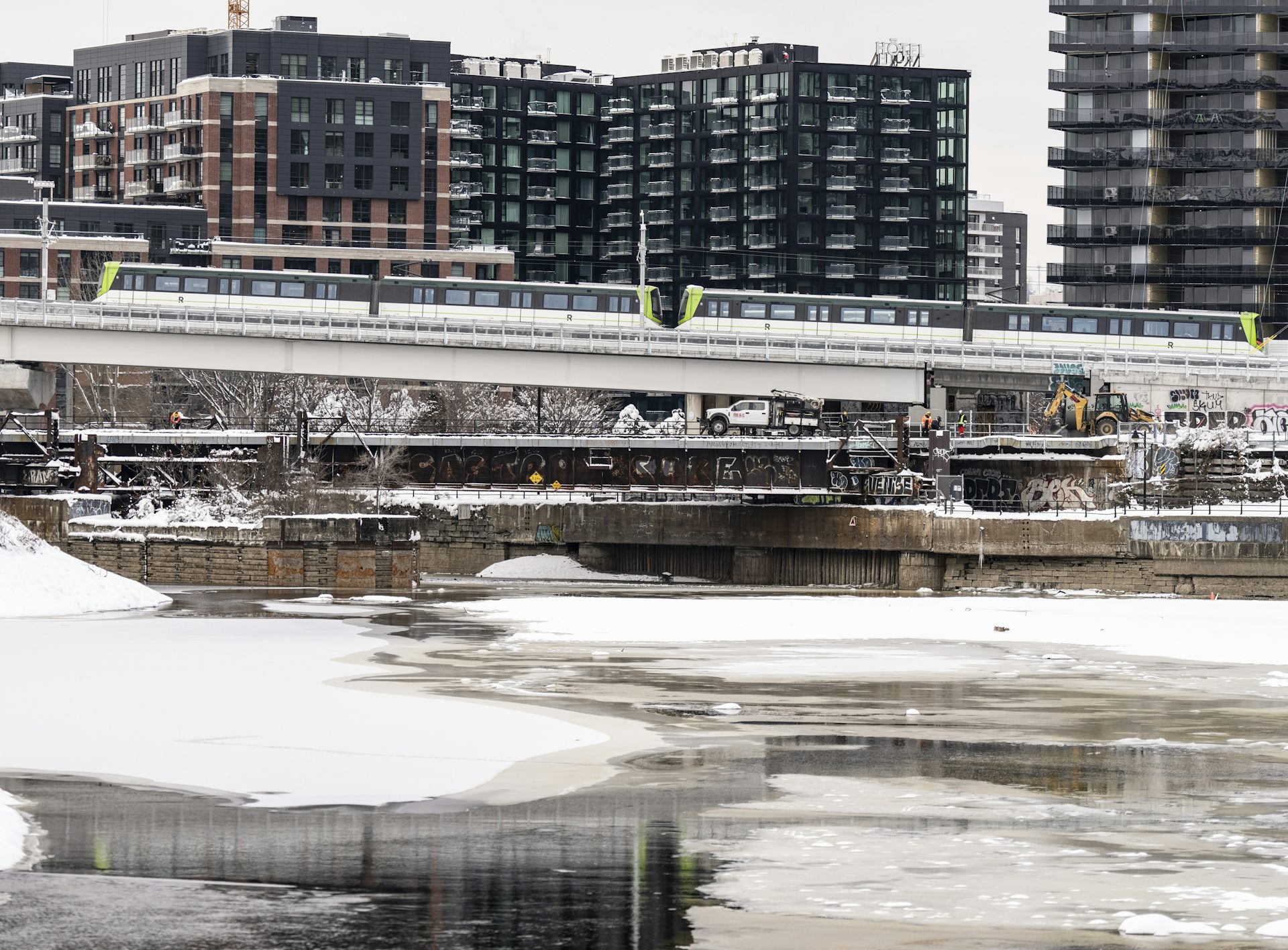 Le train Reseau express métropolitain (REM) à la sortie du centre-ville de Montréal, le 8 décembre 2023.