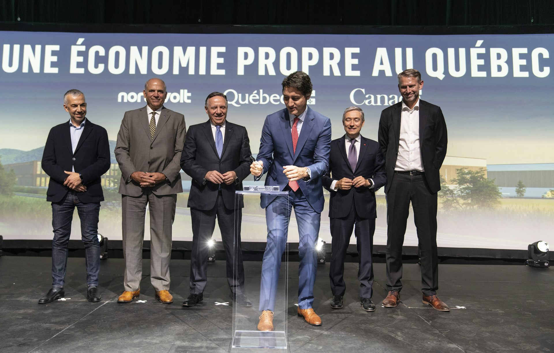 Une brochette de politiciens et de gens d'affaires, dont le premier ministre Justin Trudeau et son homologue François Legault, réunis lors de l'annonce de l'implantation de l'usine Northvolt, à Saint-Basile-le-Grand, le 28 septembre 2023.
