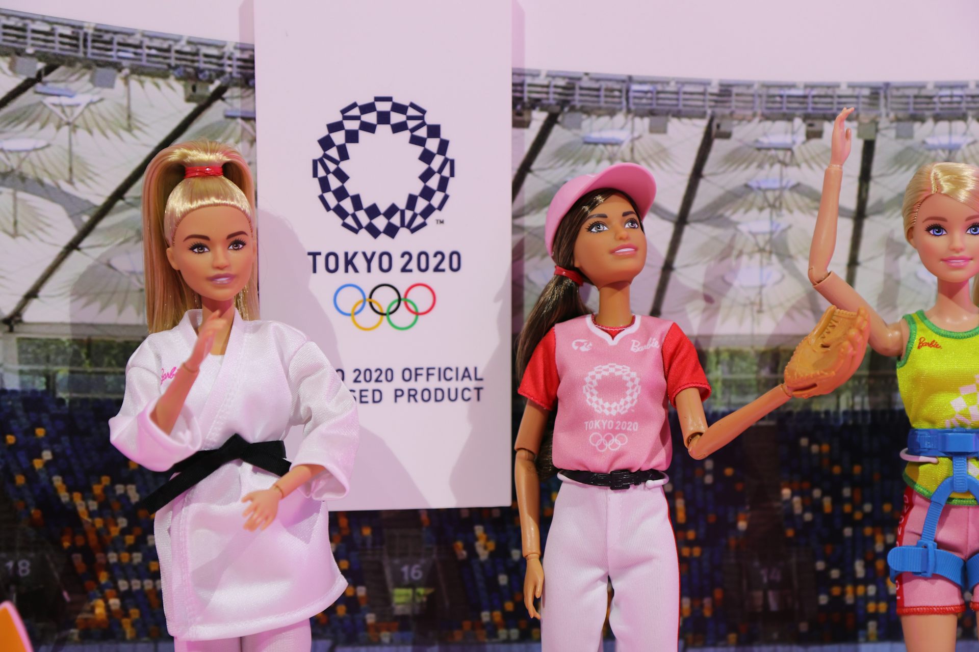 Des poupées Barbie en tenue de sport, lors de la foire commerciale de Mattel, à New York, en 2020. Les parents millénariaux recherchent des jouets moins stéréotypés pour leurs enfants.