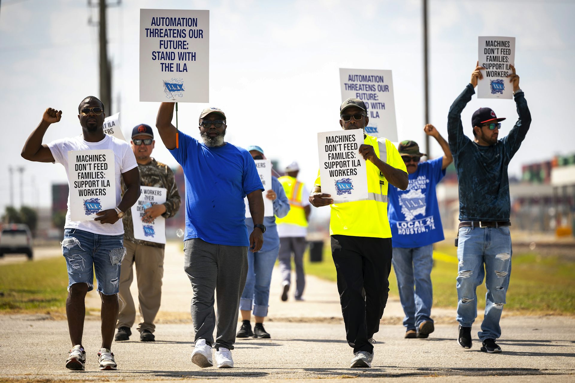 Longshoremen walk the picket line at the Barbours Cut Container Terminal during the first day of a dockworkers strike on Oct. 1, 2024, in Houston, Texas.