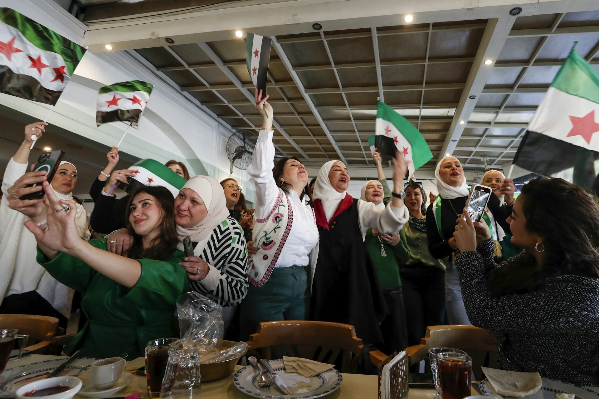 Syrian women wave Syrian flags as they celebrate the fall of the Assad regime in a restaurant in Damascus, Syria, in December 2024.