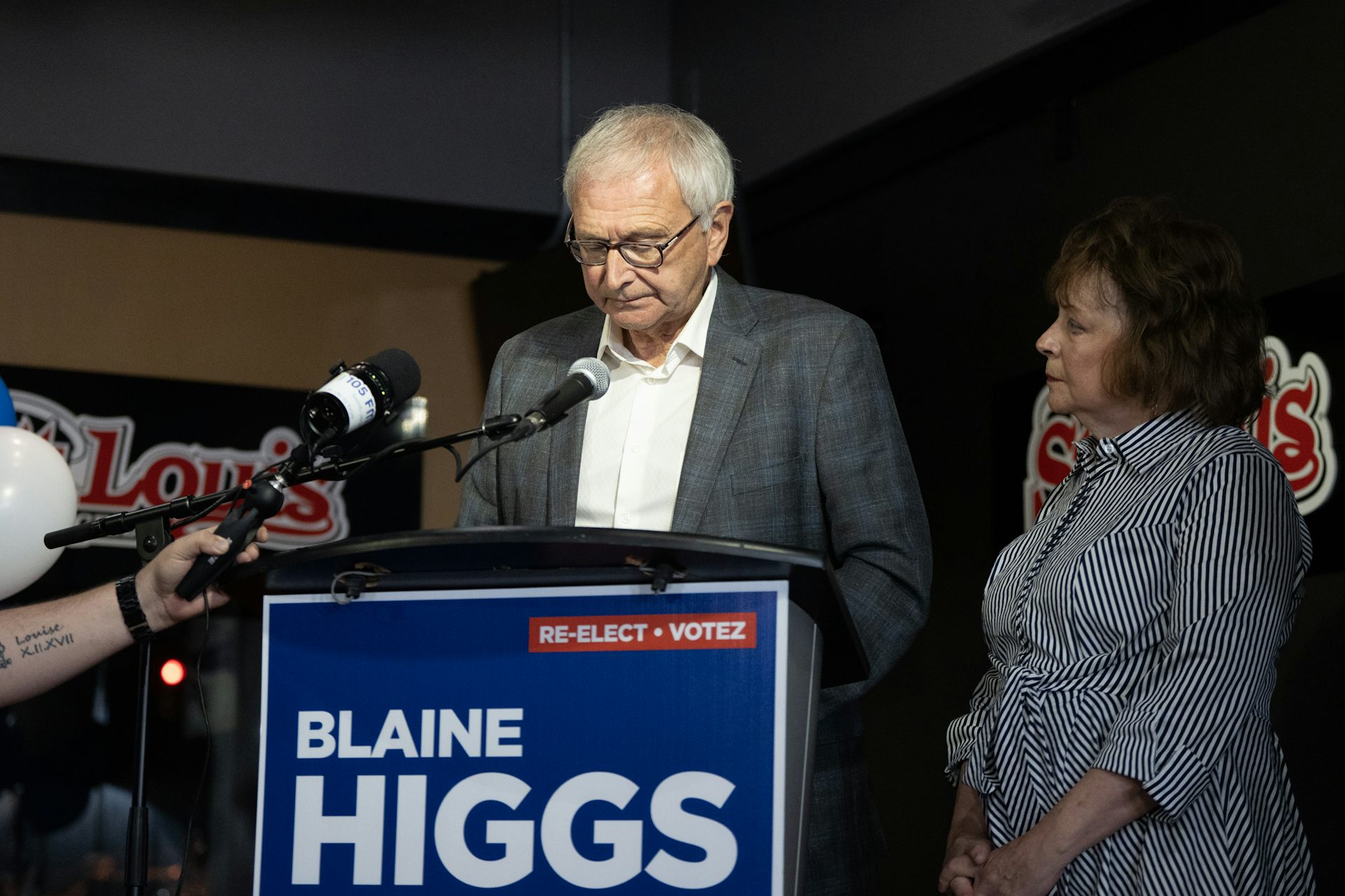 Blaine Higgs delivers a concession speech with his wife, Marcia Higgs, standing beside him in Quispamsis, N.B., following the results of the provincial election on Oct. 21, 2024.