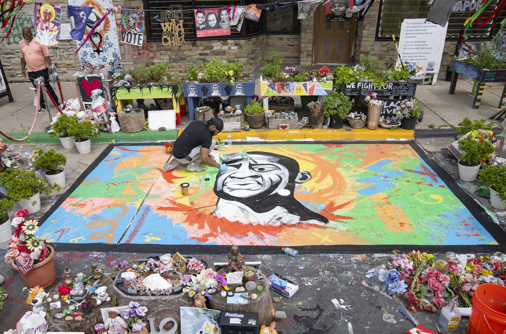 Antonio Jenkins paints a mural of George Floyd at the site where he was murdered by a police officer in 2020 at George Floyd Square in Minneapolis, on May 25, 2024.