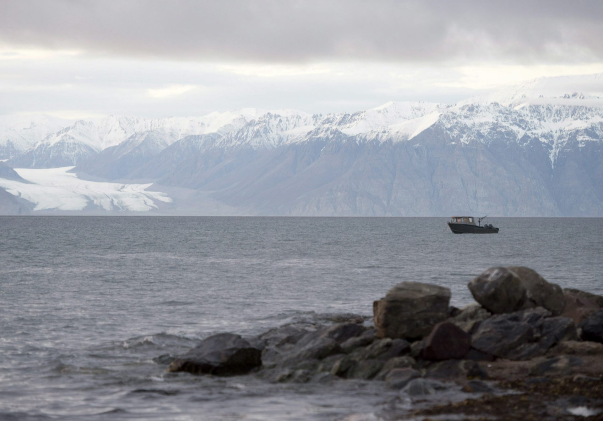 A small fishing boat sits at anchor off the hamlet of Pond Inlet, Nunavut.
