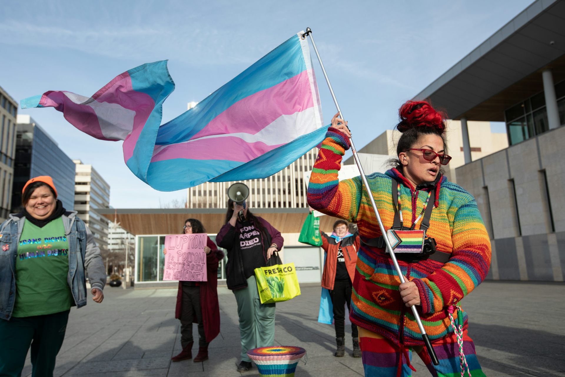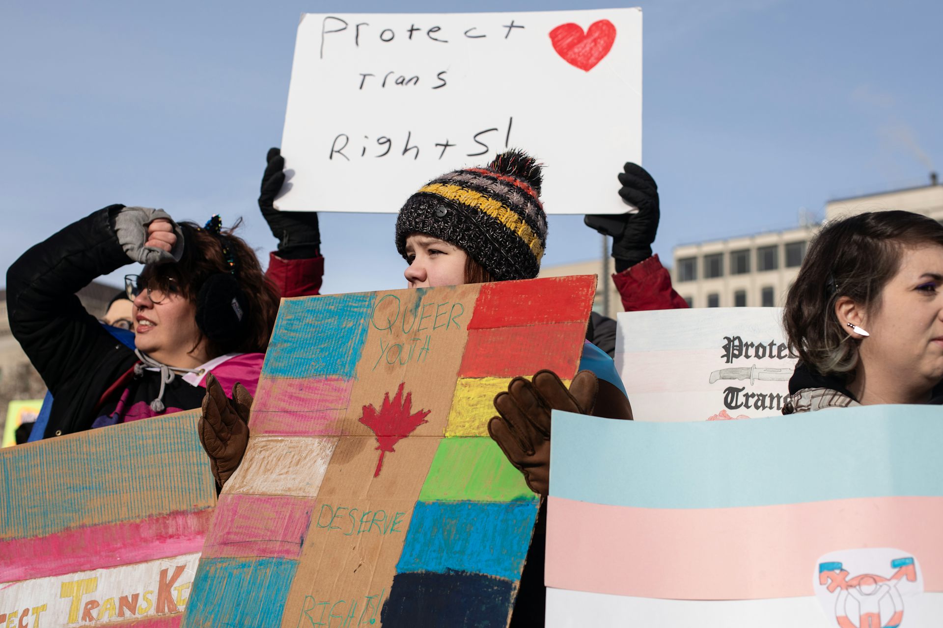 Protesters at a rally in support of trans rights in Edmonton, Feb. 4, 2024.