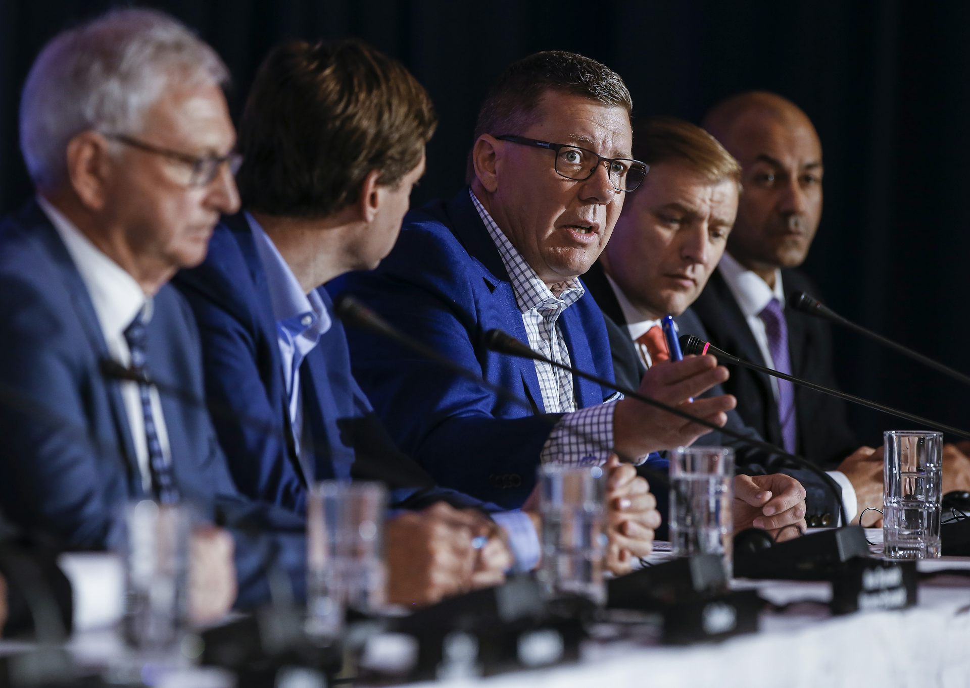 Saskatchewan Premier Scott Moe, centre, speaks to media during the closing news conference at the Council of the Federation of Canada’s premiers in Winnipeg in July.