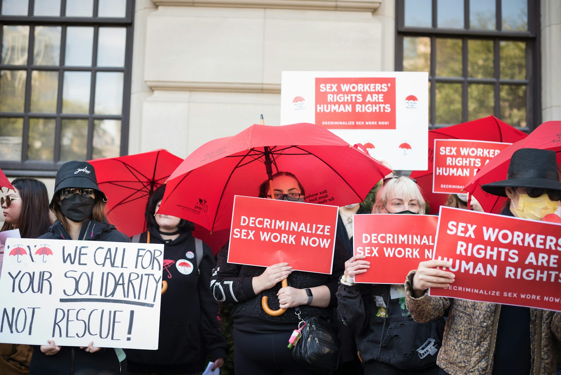 Sex workers and their supporters gather outside the Ontario Superior Court during the launch of their constitutional challenge to Canada’s sex work laws, on Oct. 3, 2022.