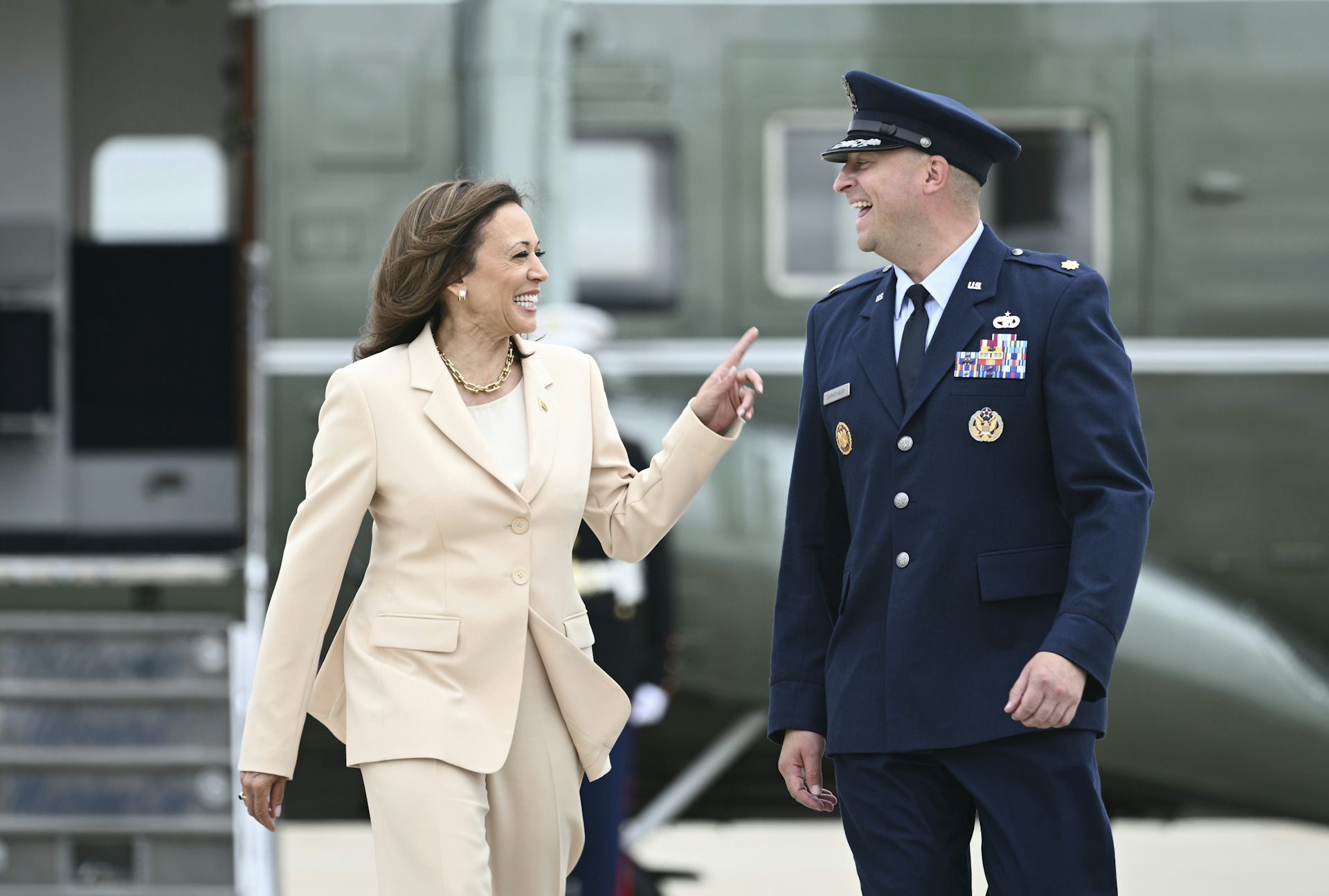 Vice President Kamala Harris arrives to board Air Force Two at Andrews Air Force Base, Md., on July 24, 2024, escorted by a U.S. Air Force official.