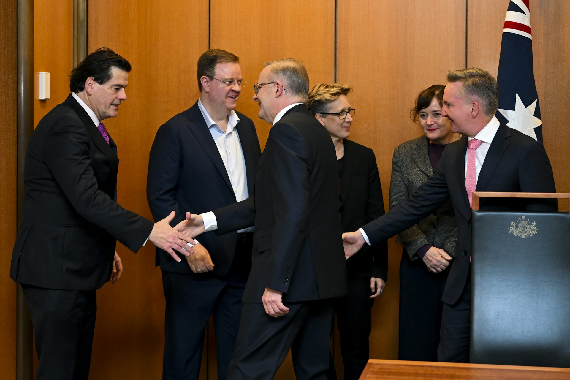 Prime Minister Anthony Albanese and Australian Minister for Climate Change Chris Bowen greet Chief Executive of the Australian Industry Group Innes Willox and Secretary of the Australian Council of Trade Unions Sally McManus. 2022.