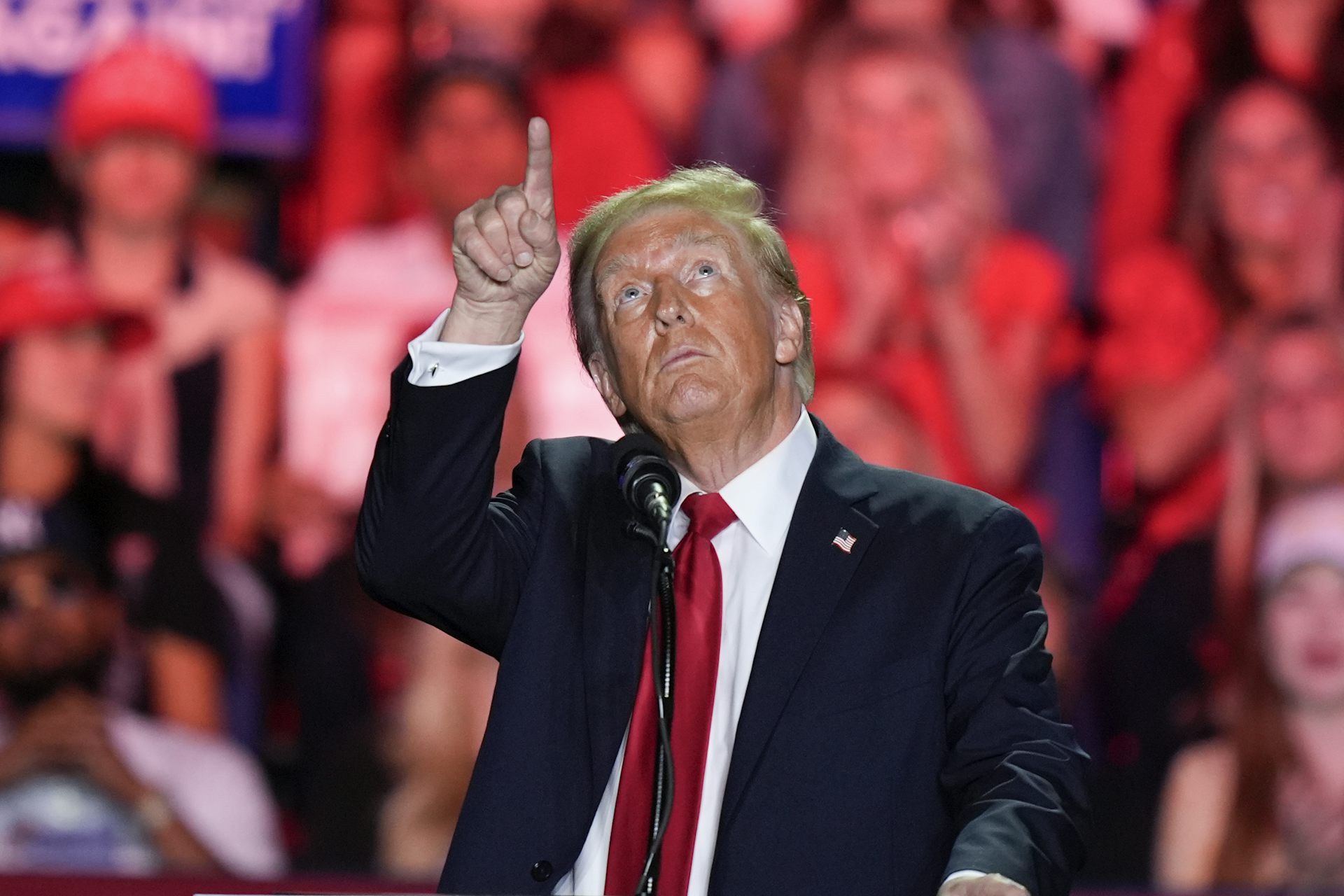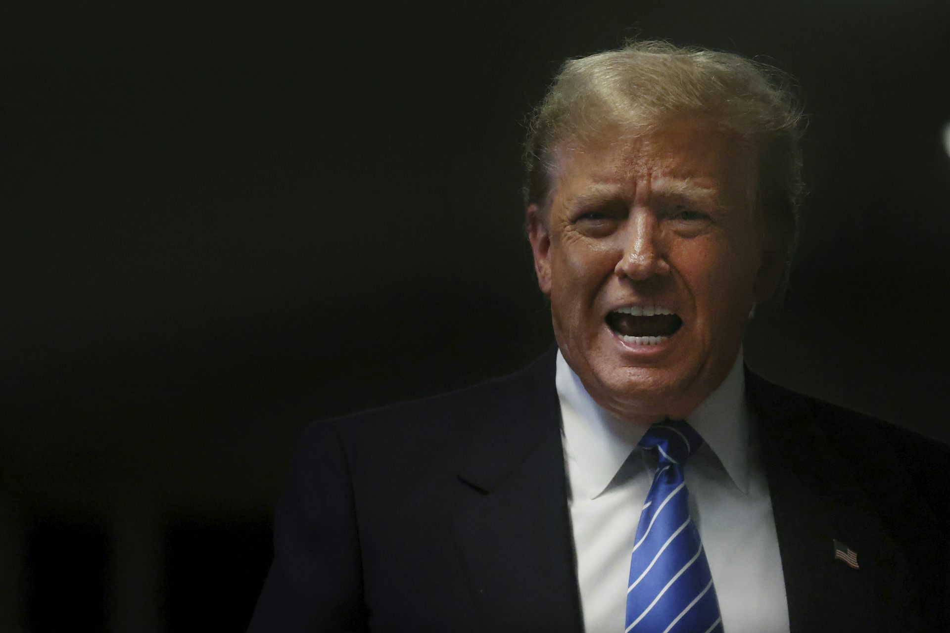 Former U.S. president Donald Trump speaks to the media at the end of the day during his trial for allegedly covering up hush money payments.