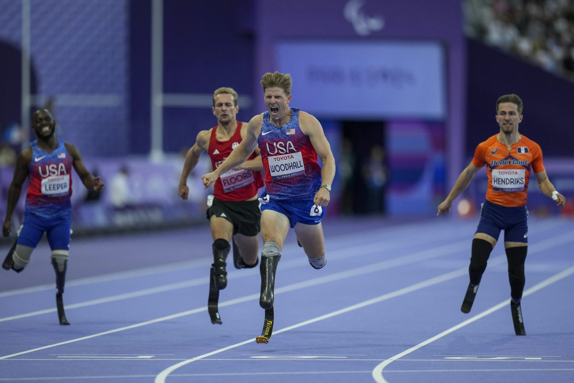 Hunter Woodhall from the U.S. wins the men’s 400-metre T62 final at the 2024 Paralympics on Sept. 6 in Paris.