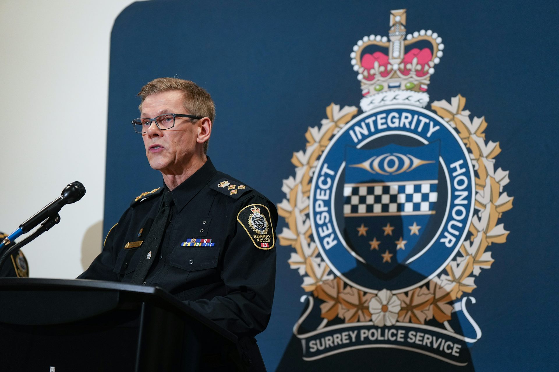 Surrey Police Chief Const. Norm Lipinski speaks during a news conference, in Surrey, B.C., in July 2023.