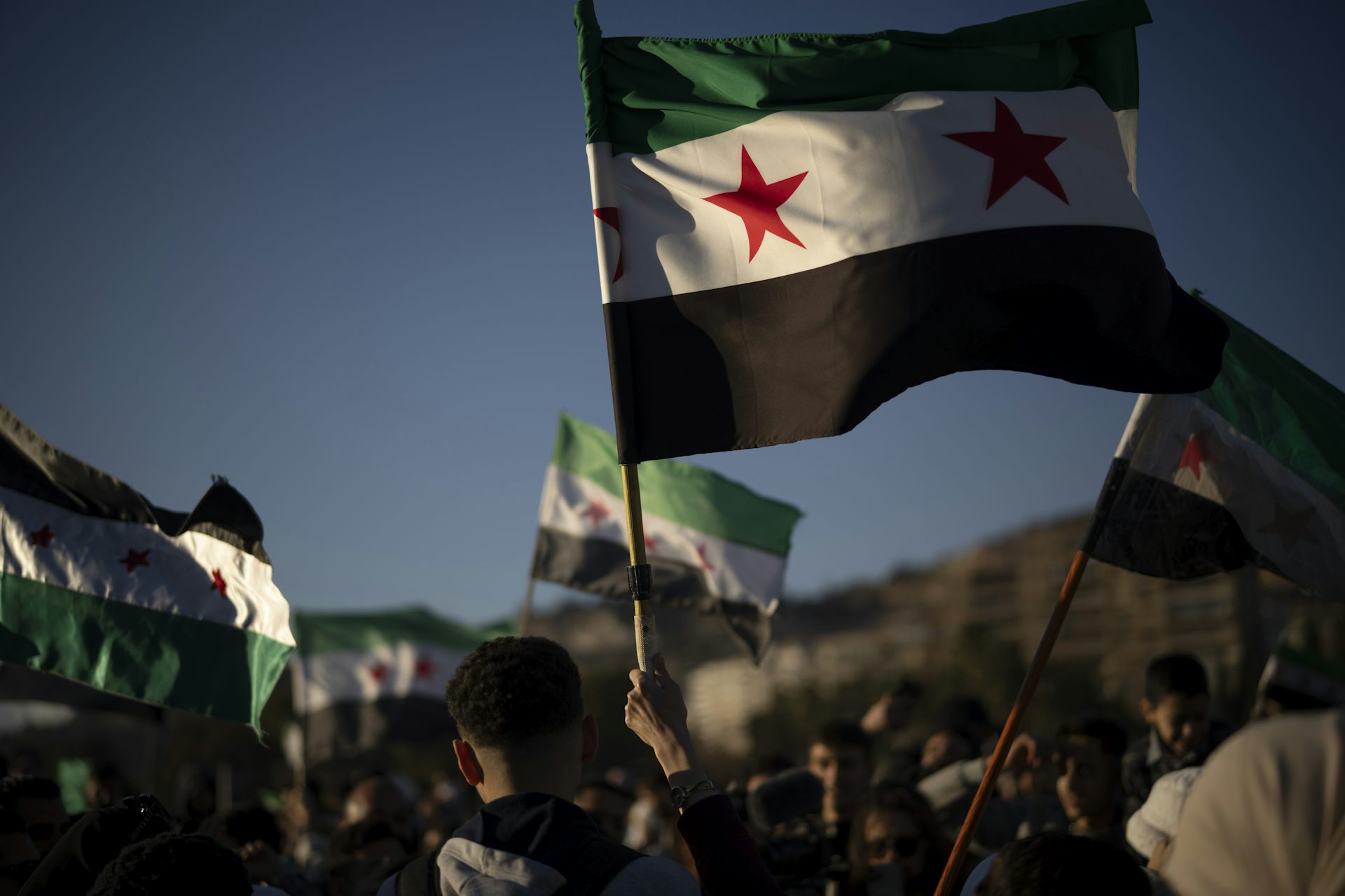 Syrians wave ‘revolutionary’ Syrian flags during a celebratory demonstration following the first Friday prayers since Bashar Assad’s ouster, in Damascus’ central square, Syria, on Dec. 13, 2024.