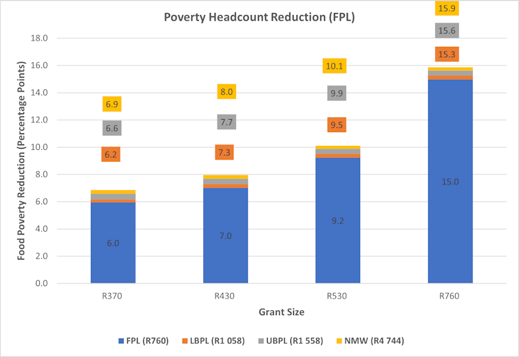 Our simulations explored the impact of maintaining the current monthly grant amount (R370, US$20.96) at different poverty lines: the 2023 food poverty line (R760, US$43,), lower bound poverty line (R1,058, US$60), upper bound poverty line (R1,558, US$88.26) and national minimum wage (R4,744, US$270.84). The food poverty line, also referred to as the extreme poverty line, is the amount of money that one needs to afford minimum required daily energy intake – approximately 2,000 kilocalories per day. The upper-bound and lower-bound poverty lines both include basic non-food items, however, at varying degrees.