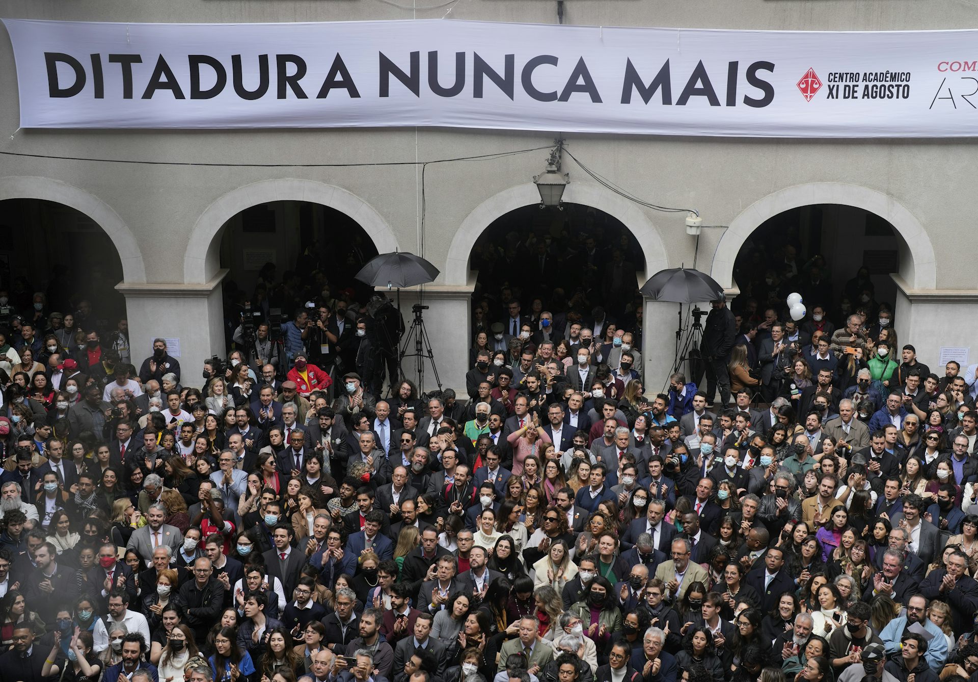 Manifestação do lado de fora da Faculdade de Direito da Universidade de São Paulo, em 2022. Filme de Walter Salles evoca não somente nossas lembranças mais profundas daqueles anos de chumbo, mas também da vida de uma mulher que se vê diante de um desafio de criar cinco filhos sozinha.