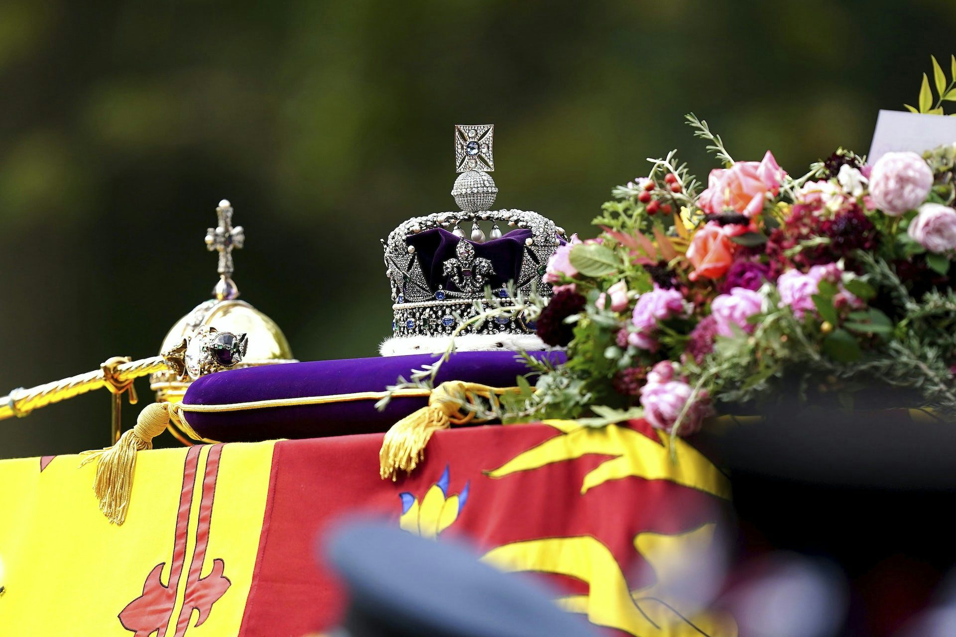 The State Gun Carriage carries the coffin of Queen Elizabeth, draped in the Royal Standard with the Imperial State Crown and the Sovereign’s Orb and Sceptre, following her funeral at Westminster Abbey in London in September 2022.