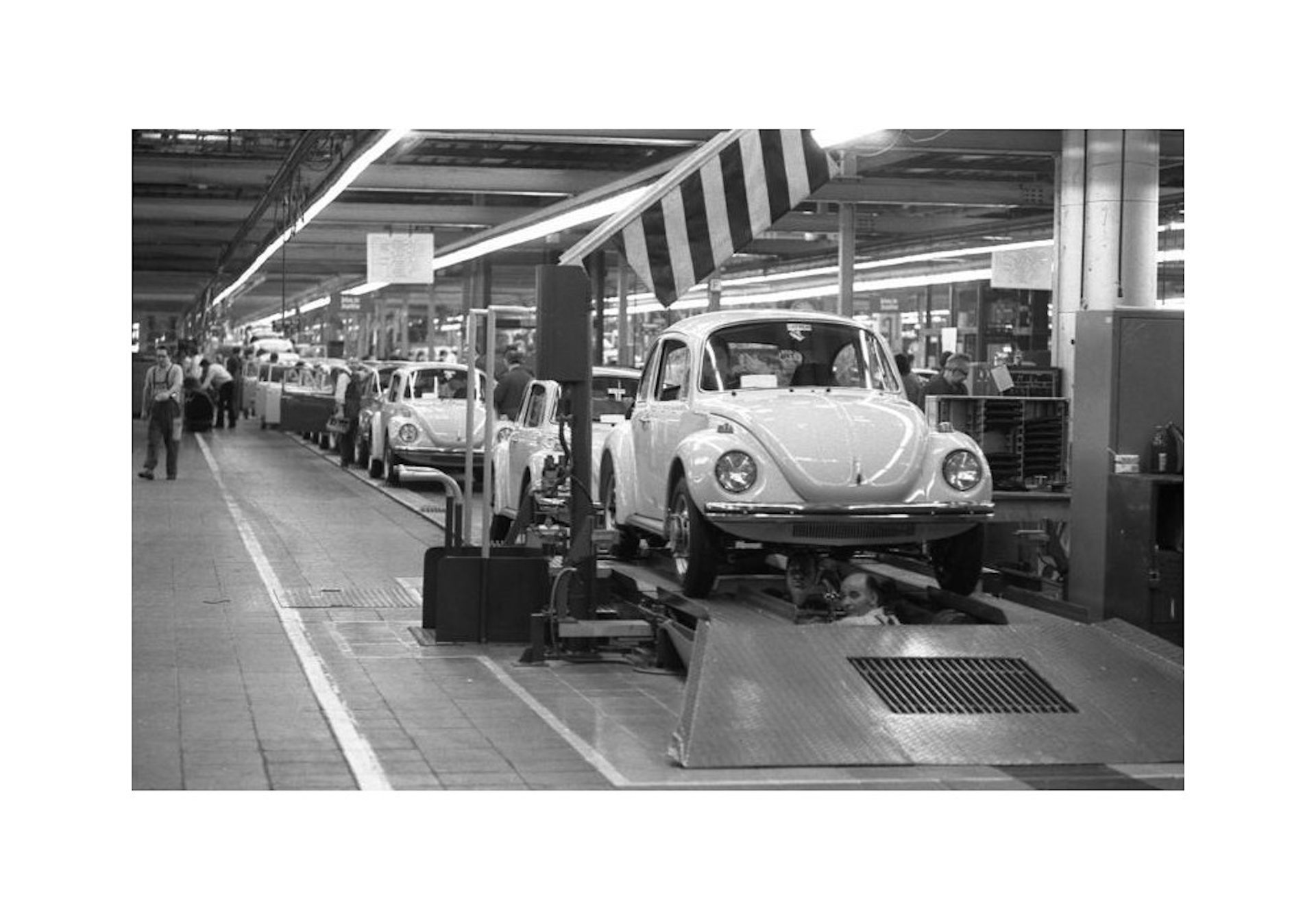 Coches Volkswagen Beetle, símbolo del despegue económico alemán, en la cadena de montaje de la fábrica de Wolfsburg, 1973.