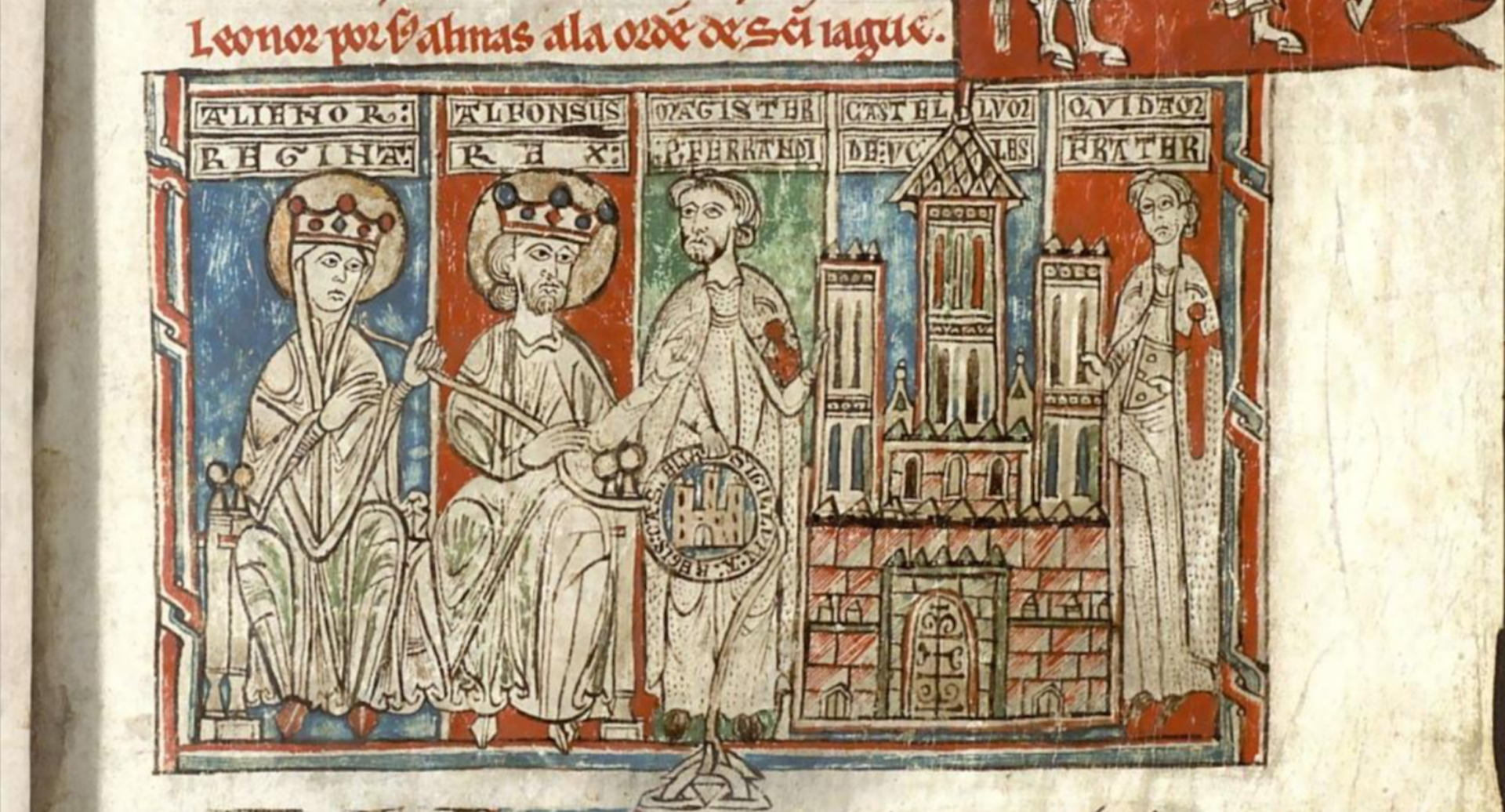 Minuatura en el folio 15 del ‘Códice 1046B: Tumbo Menor de Castilla’ que representa la donación real a la Orden de Santiago en el que aparecen la reina consorte de Castilla Leonor Plantagenet, el rey Alfonso VIII de Castillla, Pedro Fernández de Fuencalada, primer maestre de la Orden y Andrés de Loyo, prior del Convento de Uclés.