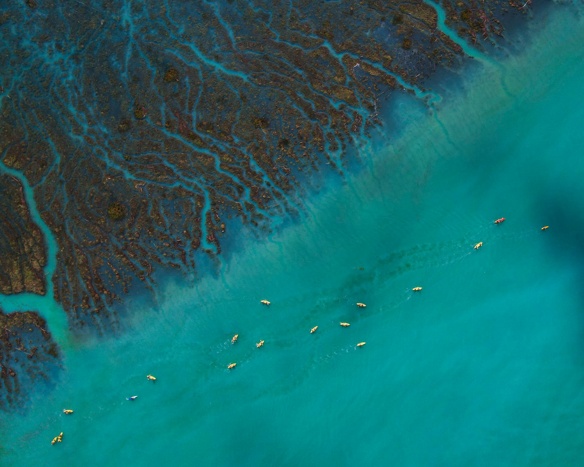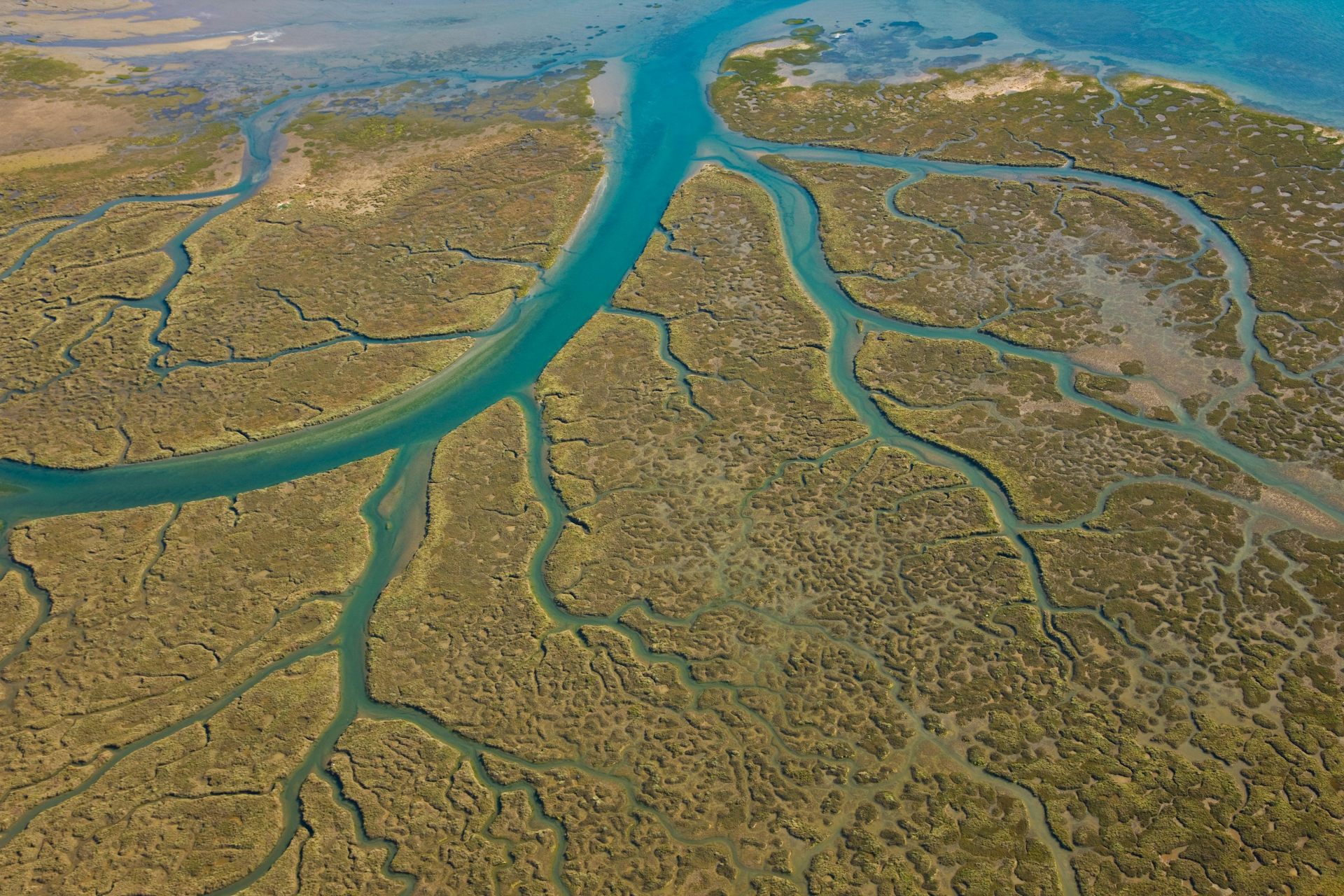 Aguas turquesas del canal principal del Odiel inundando el borde de la marisma y los esteros que la drenan.
