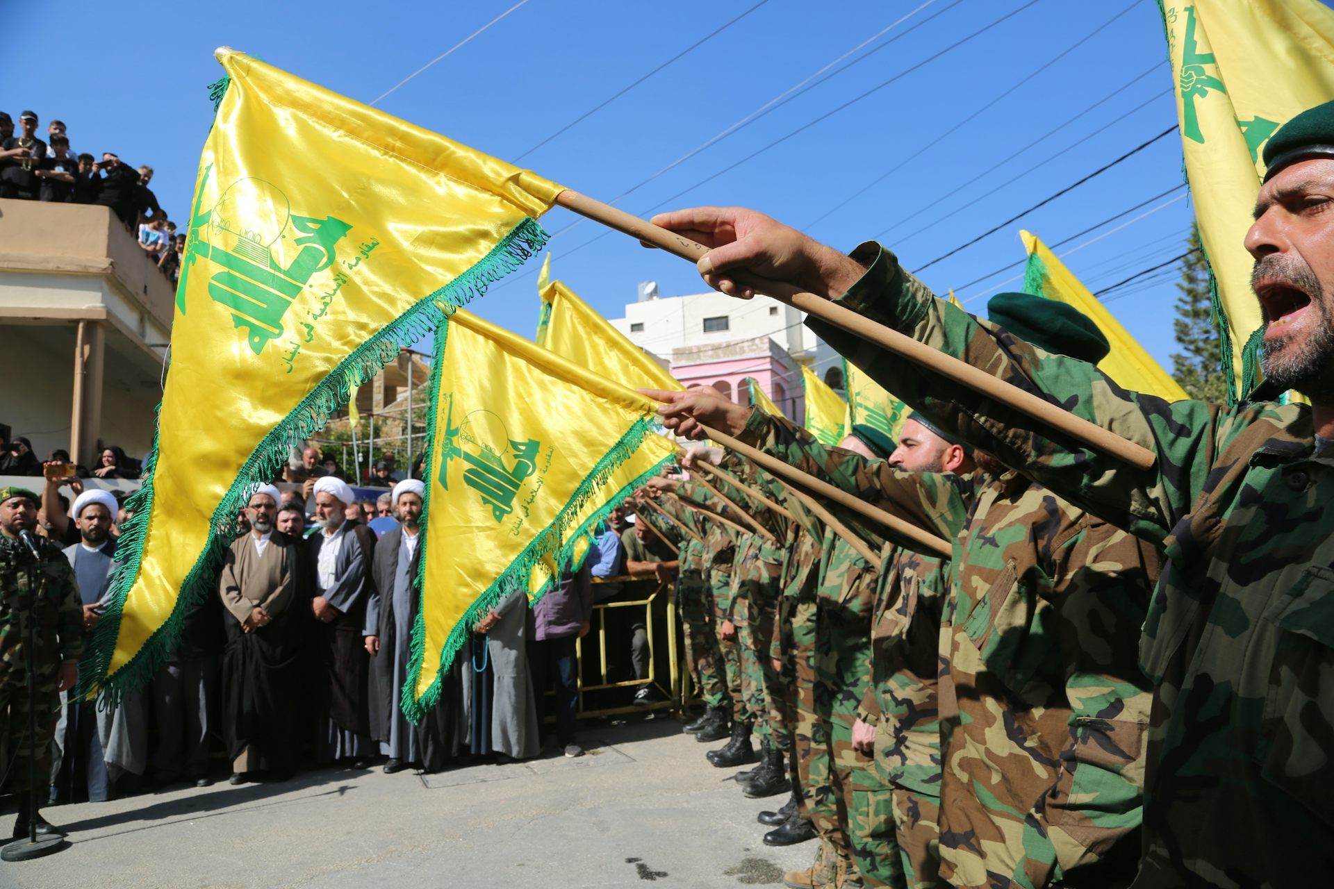 Militares enarbolan la bandera de Hezbolá.