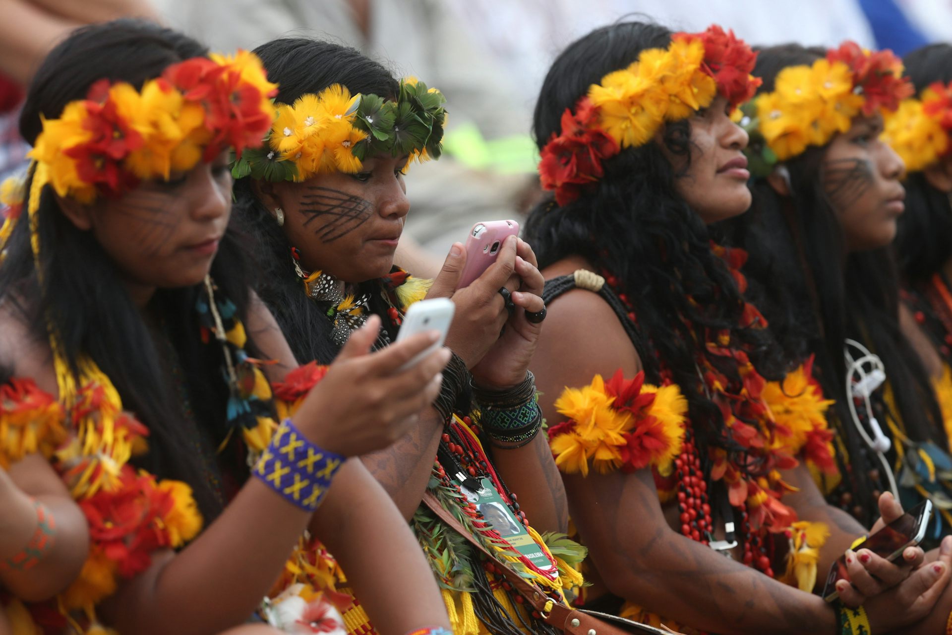 Mulheres da nação Paresi usando seus celulares durante um evento em Palmas, no Tocantins: Instagram e YouTube registram número cada vez maior de contas de indígenas mobilizadas em denunciar crimes ambientais, preservar suas culturas e defender direitos civis.