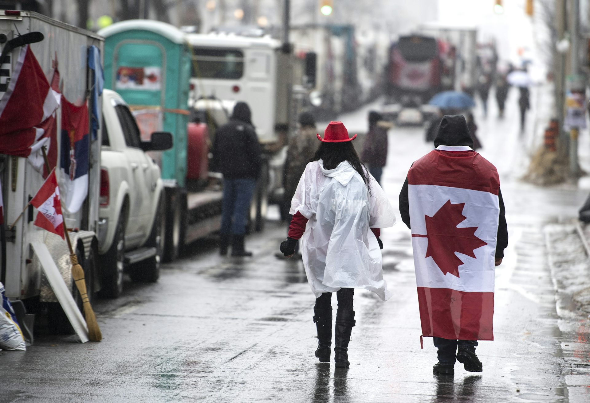 Des personnes marchent le long de la rue Wellington, dans le centre-ville d'Ottawa, lors de la manifestation dite « convoi de la liberté » contre les mesures sanitaires, le 17 février 2022. La pandémie a servi de plateforme idéale aux conspirations d'extrême droite.