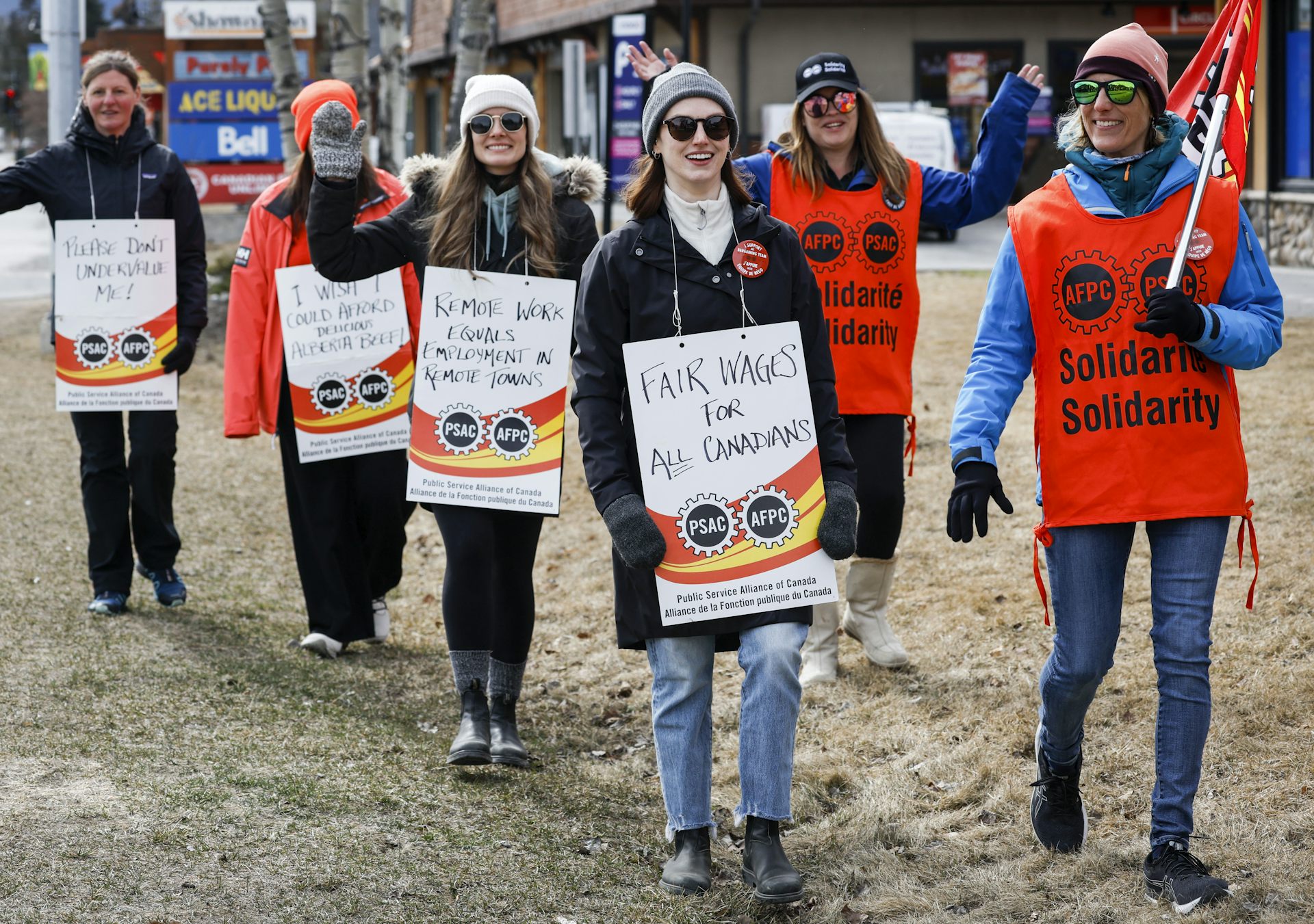 Members of the Public Service Alliance of Canada picket outside a Service Canada office in Canmore, Alta., in April 2023. More than 150,000 federal public-service workers are on strike across the country after talks with the government failed. Remote work is a negotiation issue.