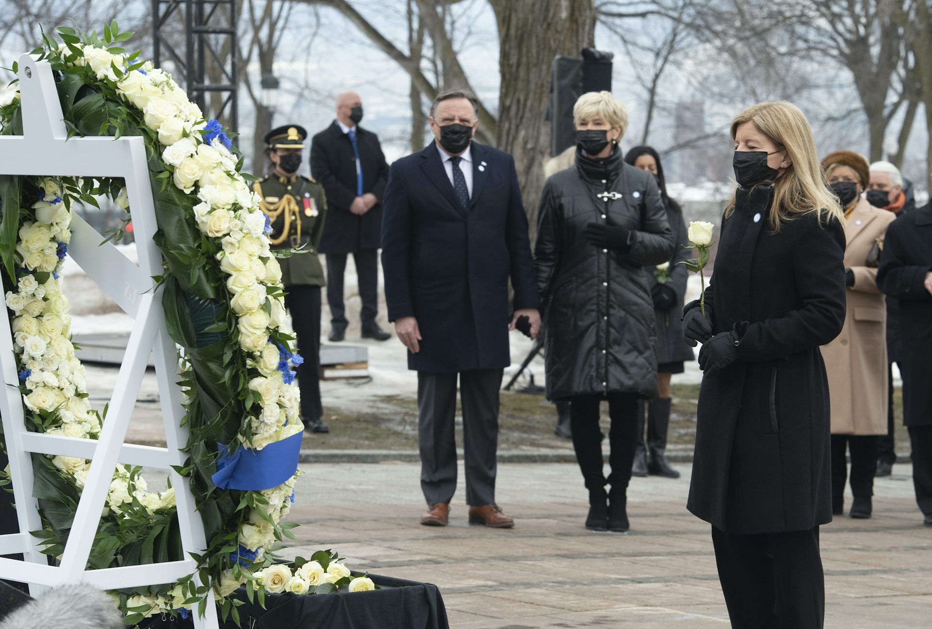 Lucie Garneau, à droite, qui a perdu son père Lucien Garneau en raison de la Covid, tient une rose devant une couronne de fleurs lors d'une cérémonie pour les victimes de la Covid-19, le jeudi 11 mars 2021, à l'Assemblée nationale de Québec. Le premier ministre du Québec, François Legault, et son épouse Isabelle Brais étaient sur place.