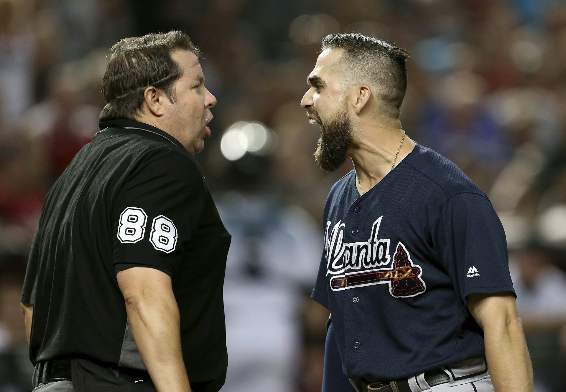 Le voltigeur des Braves d'Atlanta, Ender Inciarte, argumente avec l'arbitre du marbre, Doug Eddings, lors d'un match contre les Diamondbacks d'Arizona.