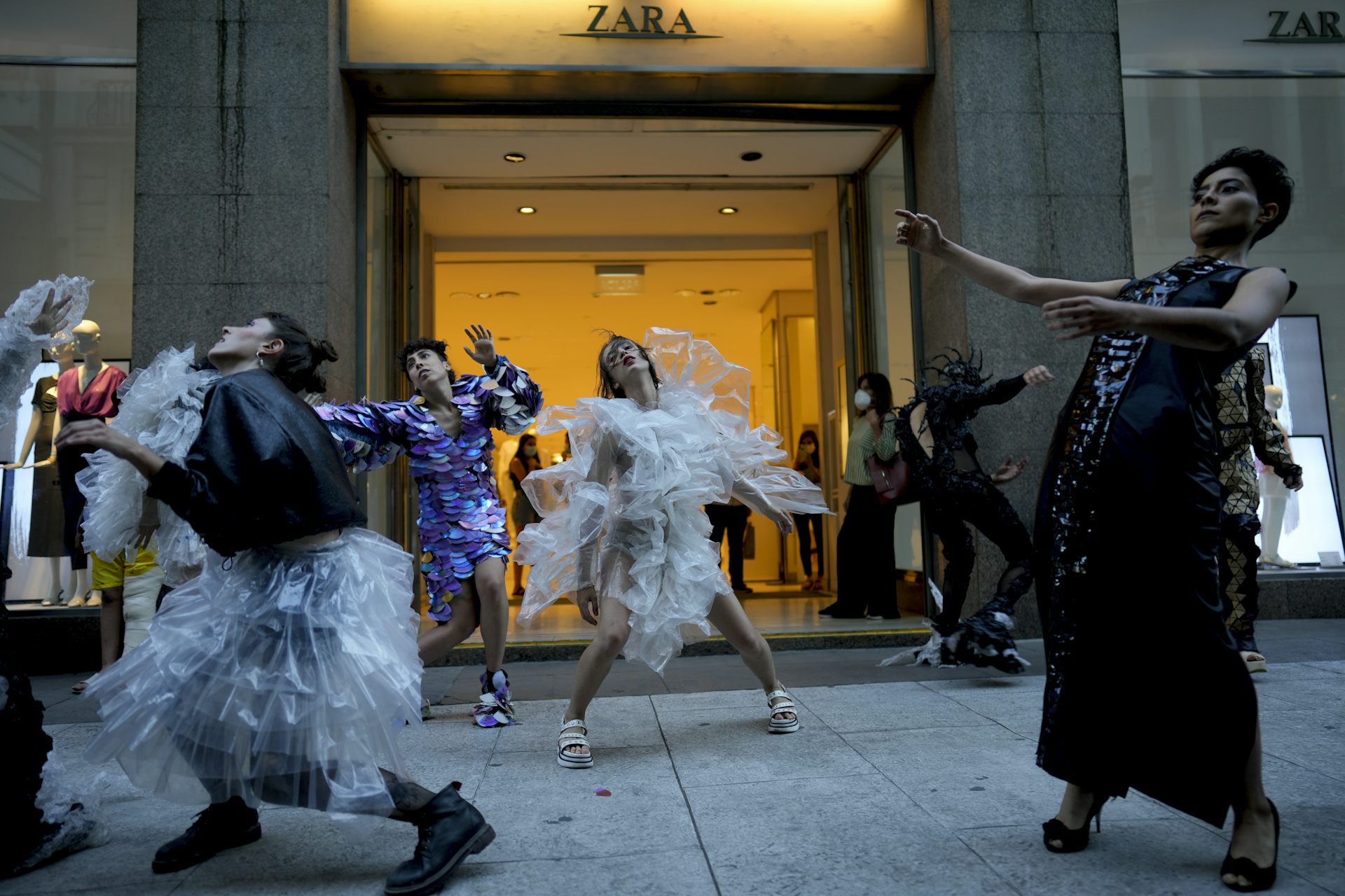 La mode éphémère a de graves conséquences environnementales et sociales. Voici quelques conseils pour vous aider à constituer une garde-robe plus durable. Sur la photo, des membres du groupe Extintion Rebellion font un numéro devant un magasin Zara à Buenos Aires, en Argentine, en 2021.