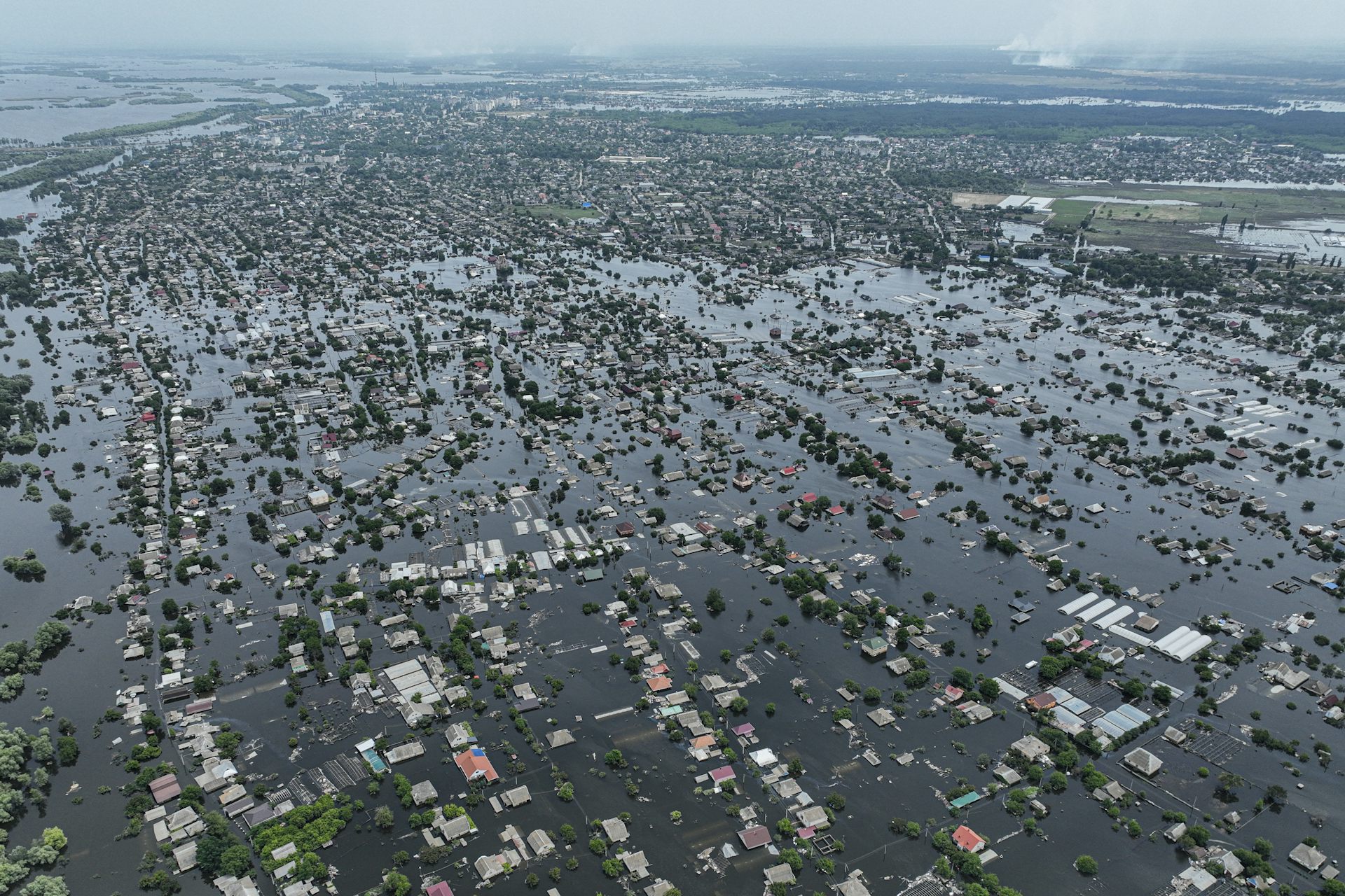 Flooded houses in the town of Oleshky, Ukraine, June 10, 2023. The floods followed the catastrophic explosion that destroyed the Kakhovka Dam in the southern Kherson region.