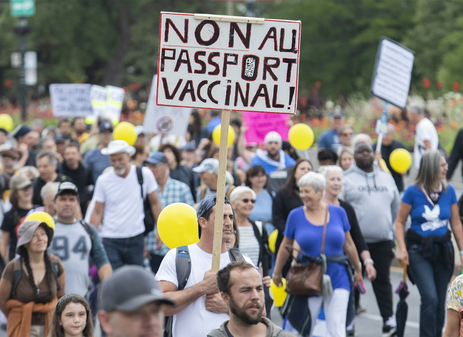 Des personnes brandissent des pancartes lors d'une manifestation contre les mesures prises par le gouvernement du Québec pour aider à freiner la propagation de la Covid-19, à Montréal, le 28 août 2021.