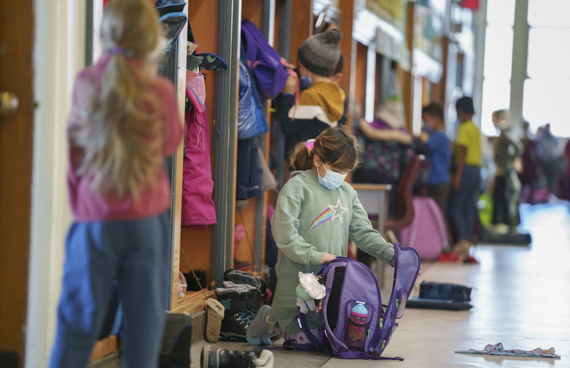 Des élèves d'une école primaire se préparent à entrer en classe à Montréal en janvier 2022.