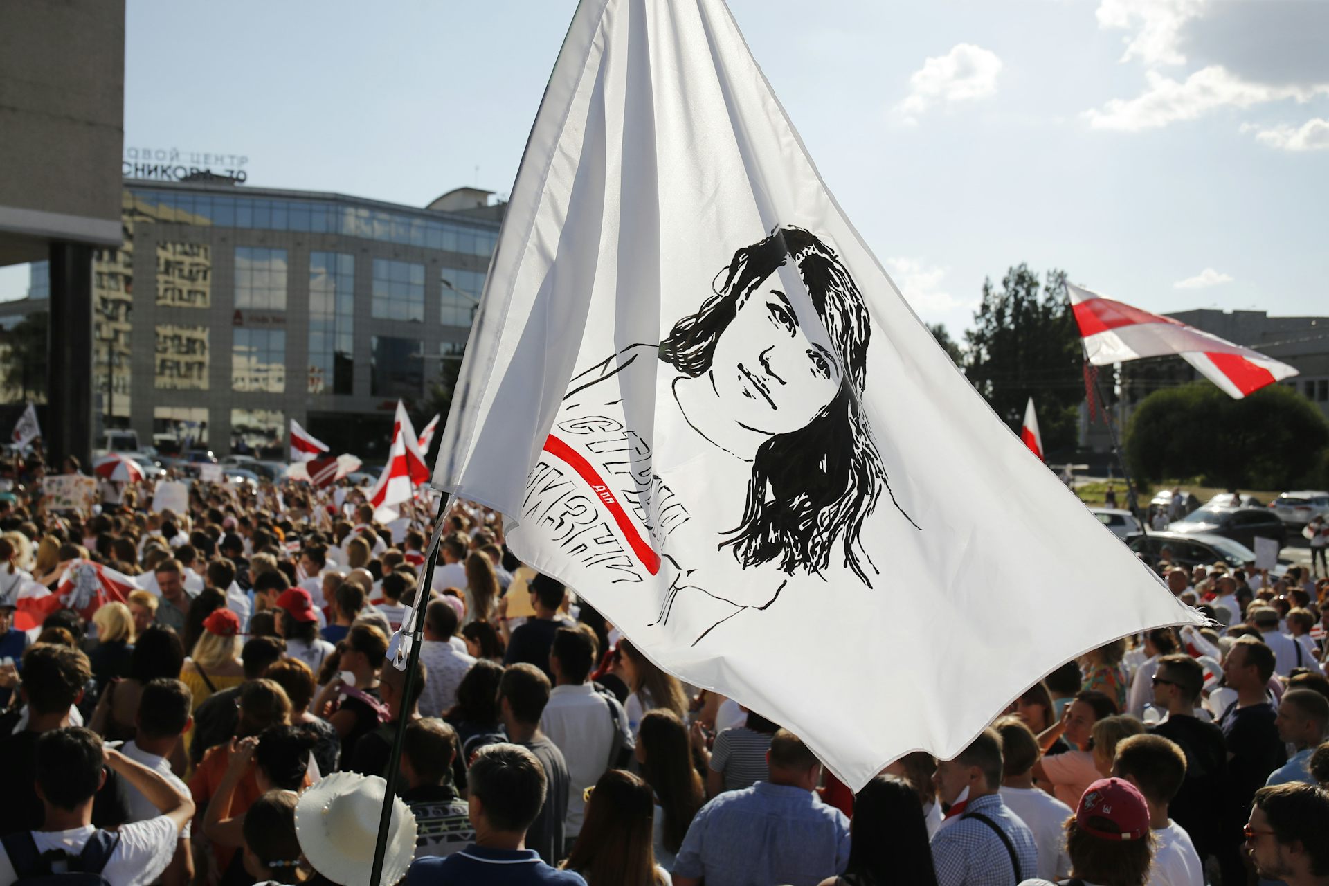 People hold a traditional Belarusian flag with a portrait of presidential candidate Sviatlana Tsikhanouskaya during a rally in Minsk, Belarus, in August 2020. She’s among 20 people being tried in absentia.