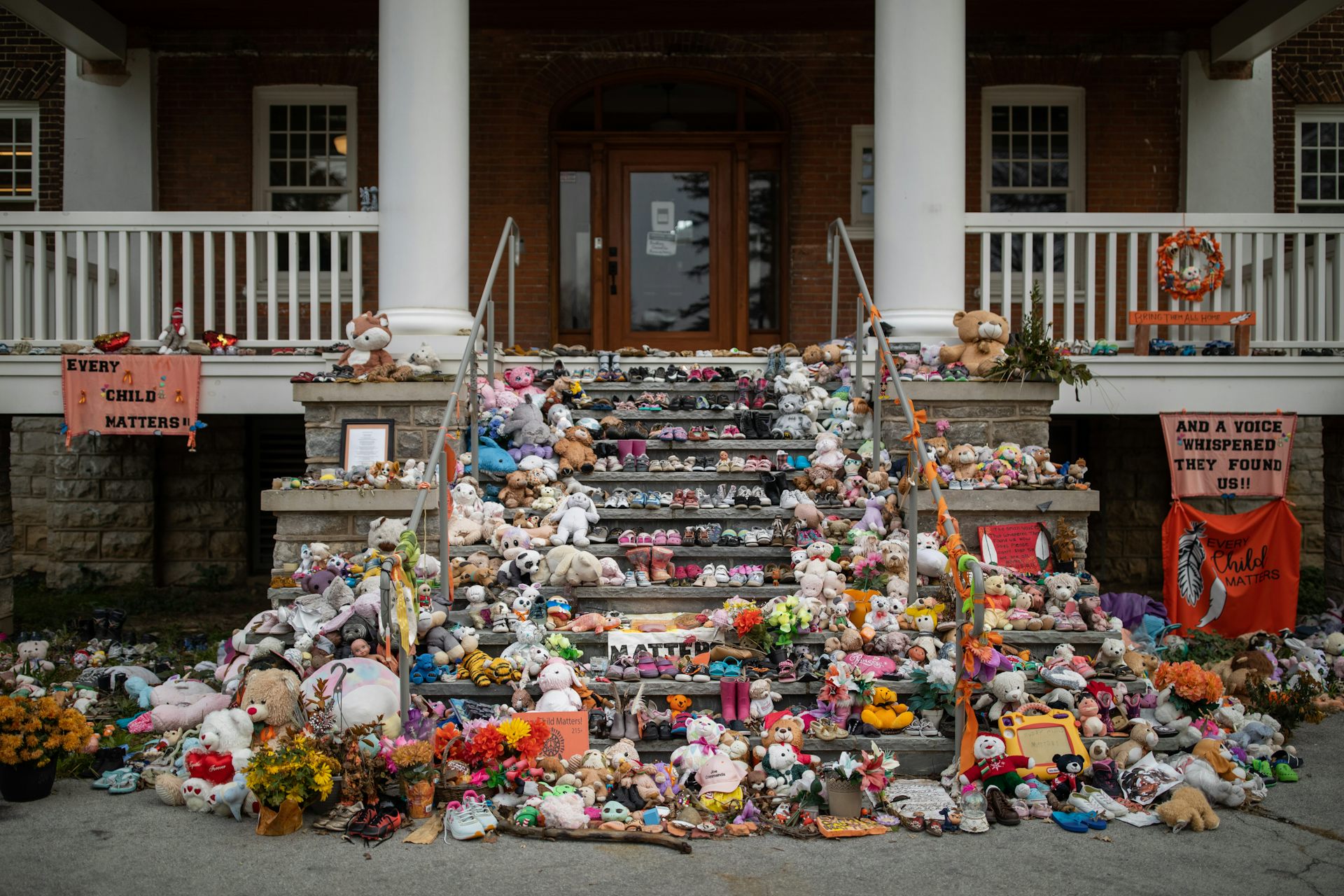 Chaussures d'enfants sur les marches menant au site de l'ancien pensionnat indien, le Mohawk Institute, à Brantford, en Ontario, en novembre 2021.